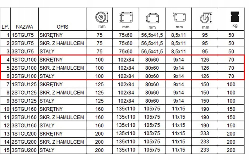 Комплект состоит из четырех колес, оснащенных пластинчатым креплением. В комплект входят два стационарных комплекта с кодом 3СТГУ100 (поз. 6 в таблице), одно поворотное колесо с тормозом, код 2СТГУ100 (поз. 5 в таблице) и одно колесо поворотное с тормозом. код 1СТГУ100 (позиция 4 в таблице).