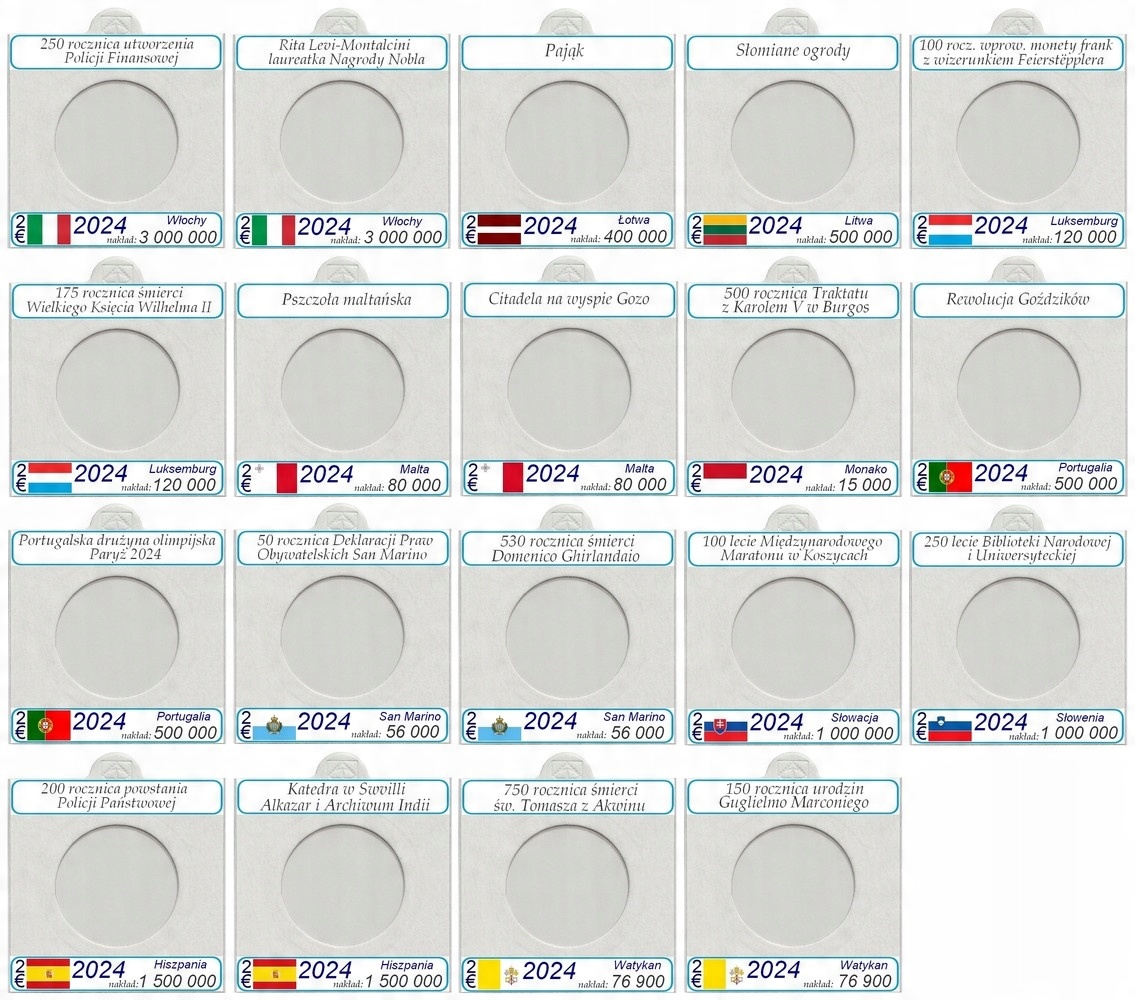 Набор из 43 держателей для 2 евро 2024 монет + описания
