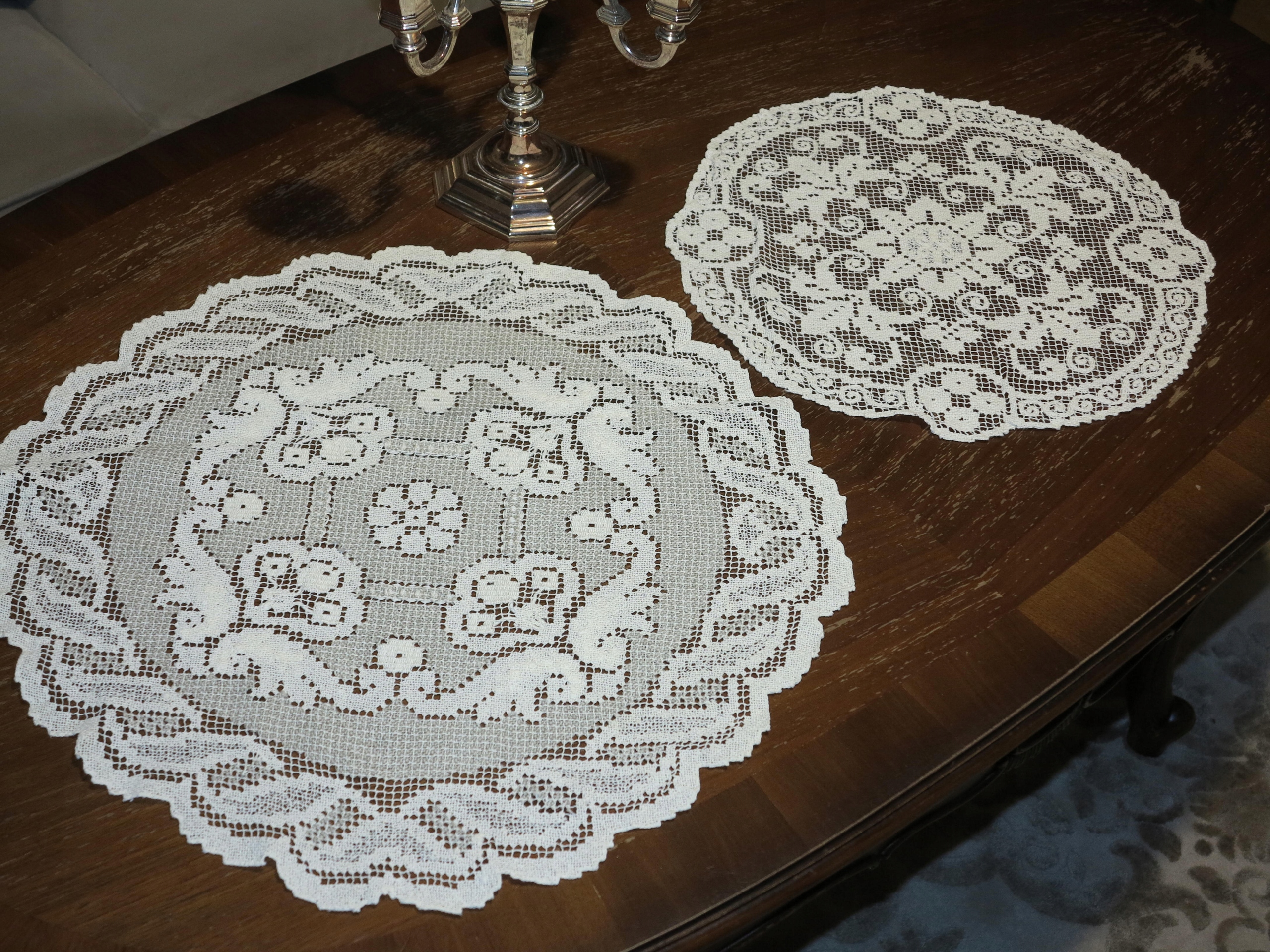 Предметом аукциона являются две красивые игольчатые салфетки. Они имеют размеры: а) 50 см, б) 38 см. Б/у, но в отличном состоянии. Рекомендую
