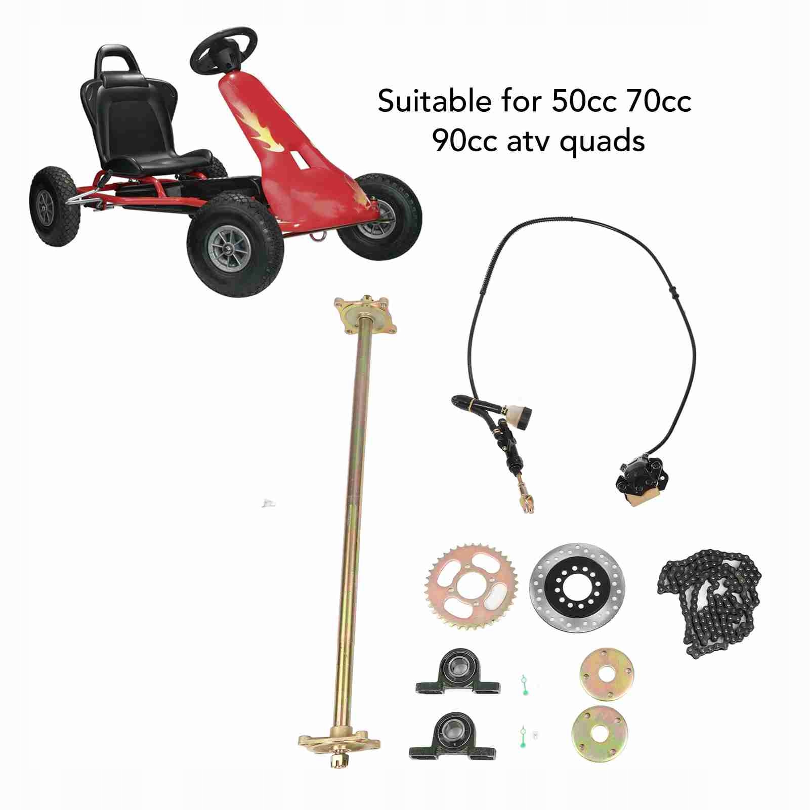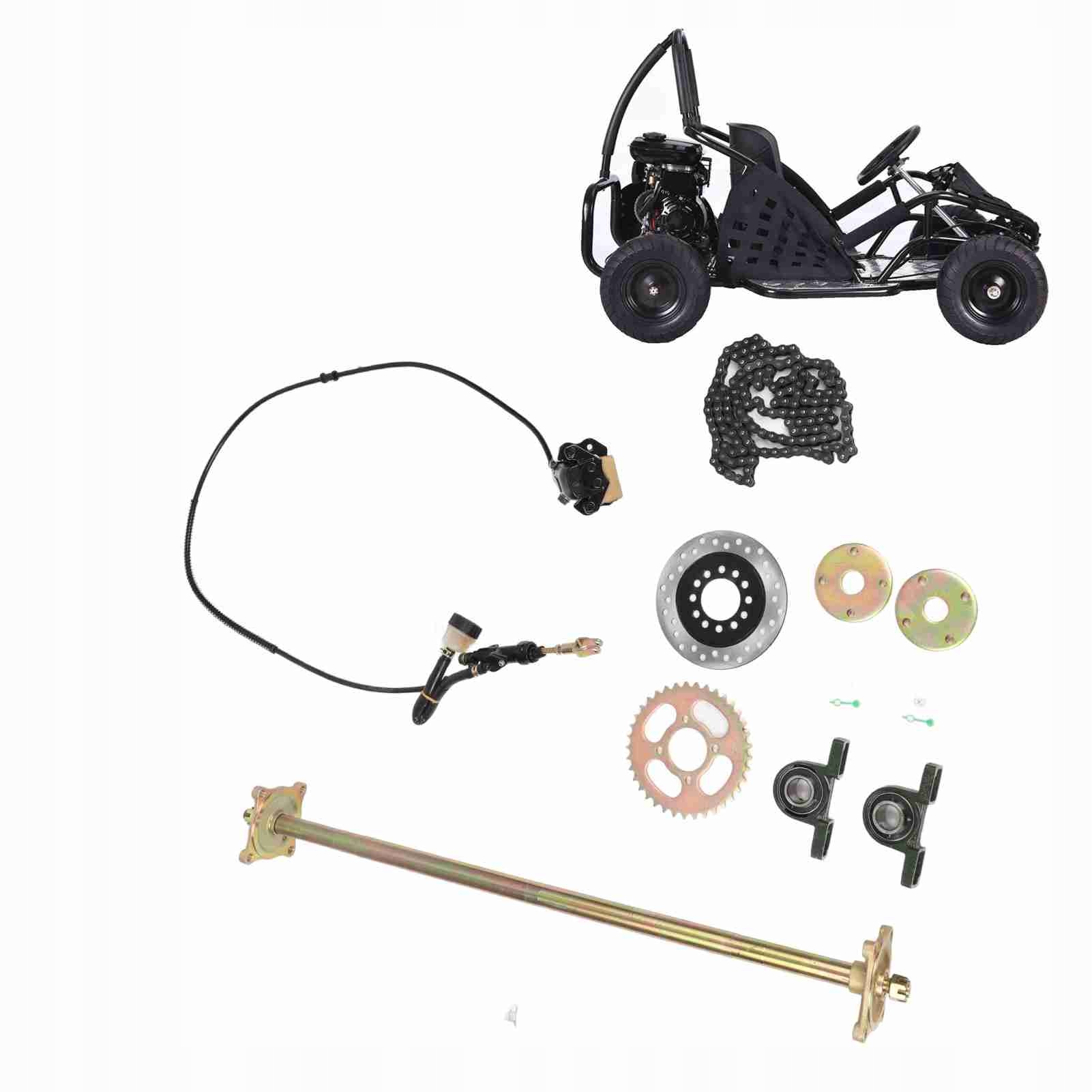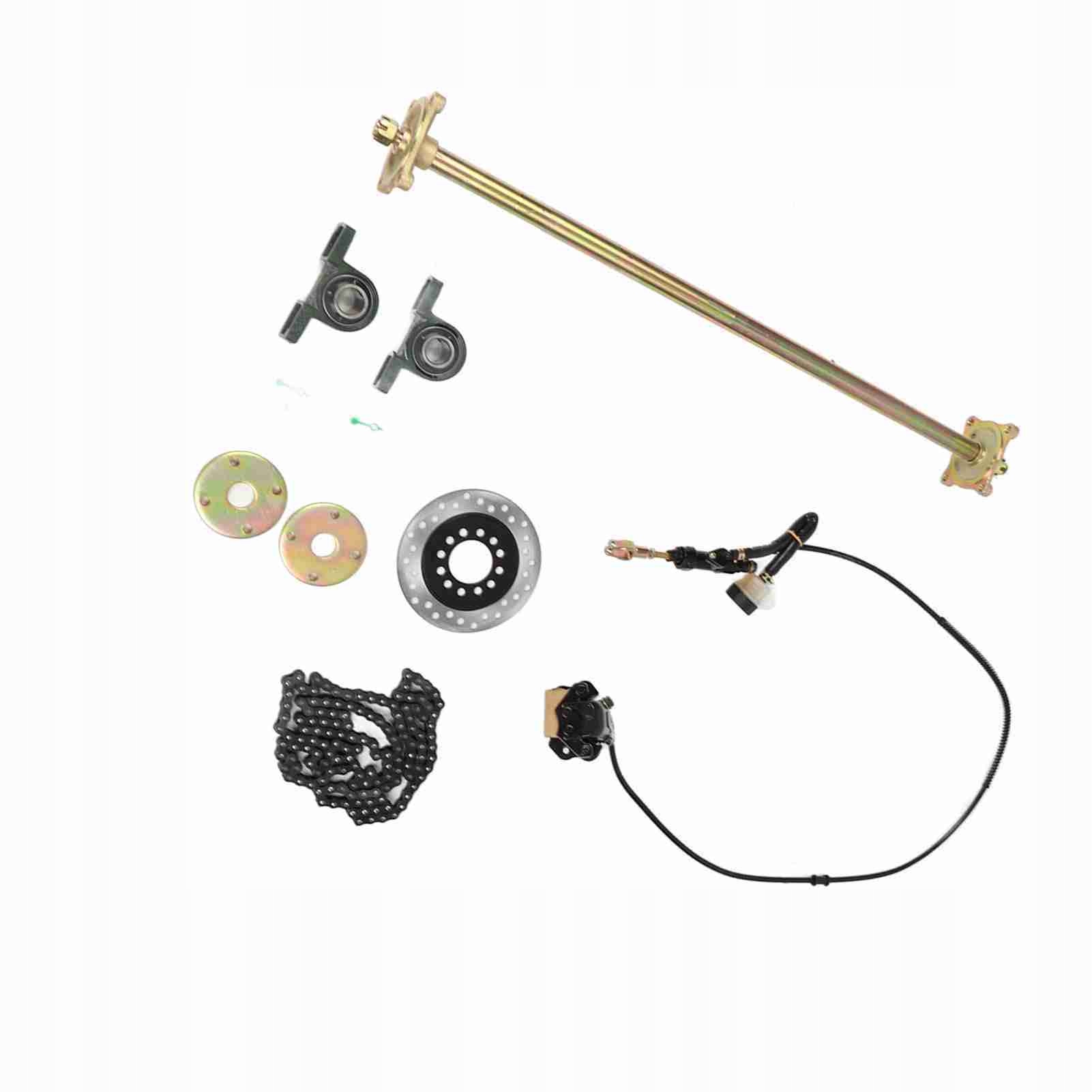 - Компоненты: задняя ось 850 мм + подшипник 205 + фланец с 23 зубьями и 4 отверстиями + звездочка типа 428 с 37 зубьями + дисковый тормоз диаметром 16 см + держатель звездочки + комплект главного тормозного цилиндра + цепь + шпилька задней оси + 140-звенная цепь.