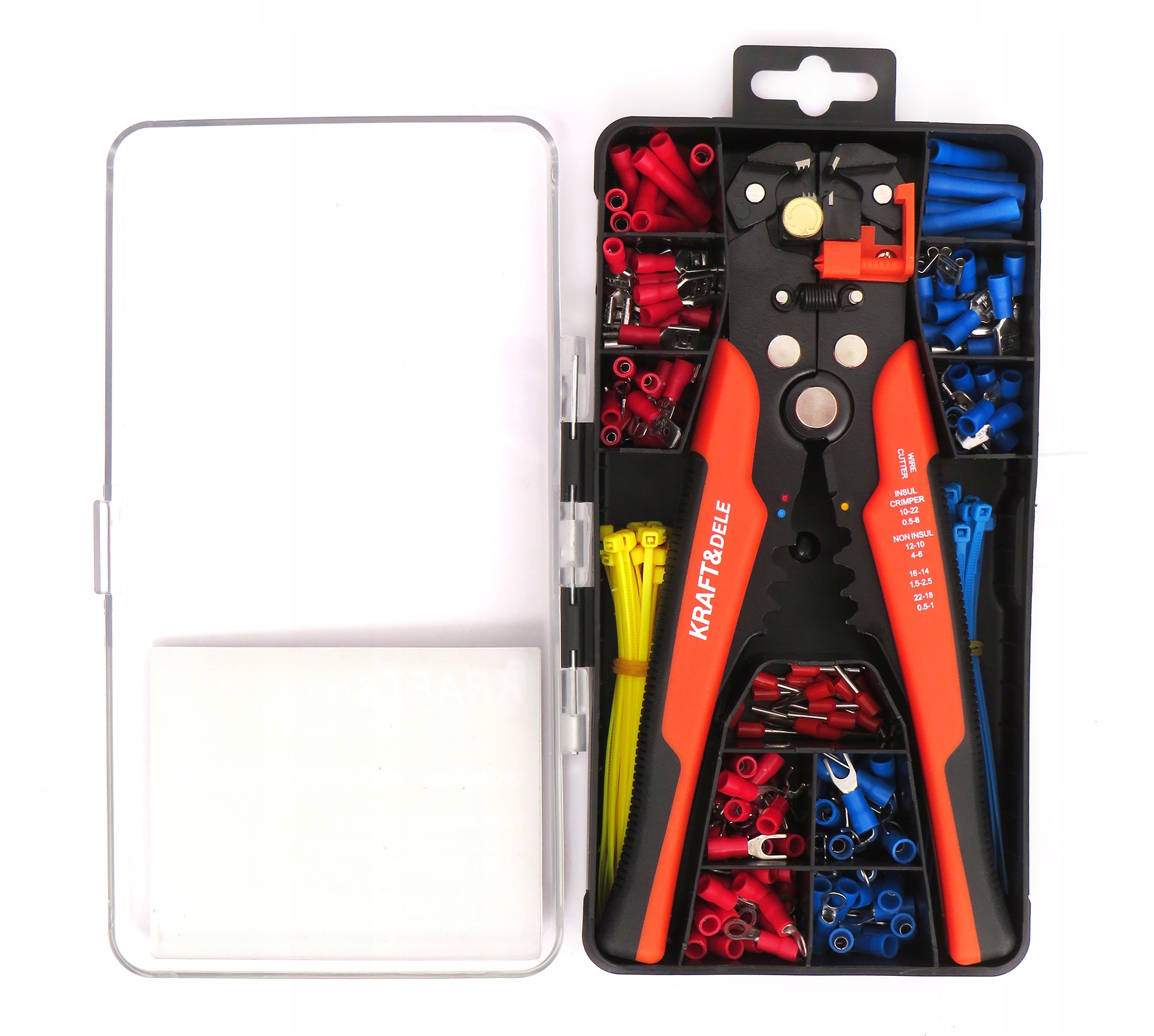 Набор многофункциональных съемников изоляции от KRAFT&DELE с изолированными гильзами и кабельными стяжками.