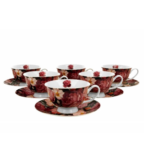 KOMPLET 6 FILIŻANEK ZE SPODKAMI SPRING ROSES BLACK RÓŻE KWIATY PREZENTOWY