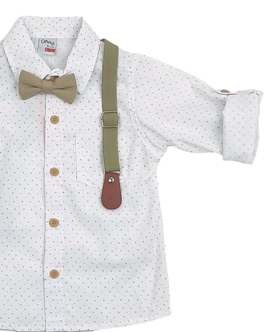 Элегантная рубашка с длинными рукавами, которые можно закатать. Модный принт на рубашке с маленькими треугольниками в цвет подтяжек и галстука-бабочки.