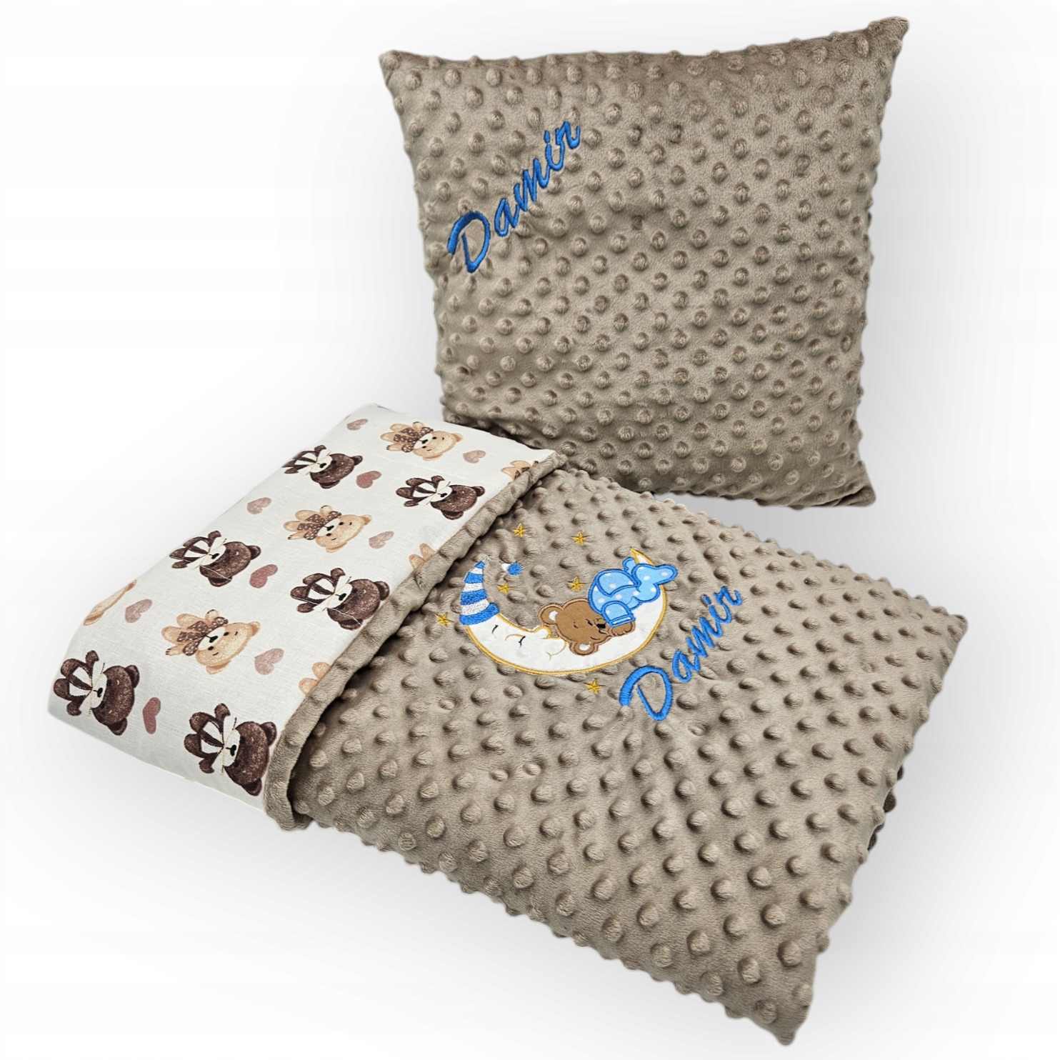 KOMPLET KOCYK PODUSZKA MINKY HAFT IMIĘ PREZENT CHRZEST CHŁOPIEC DZIEWCZYNKA