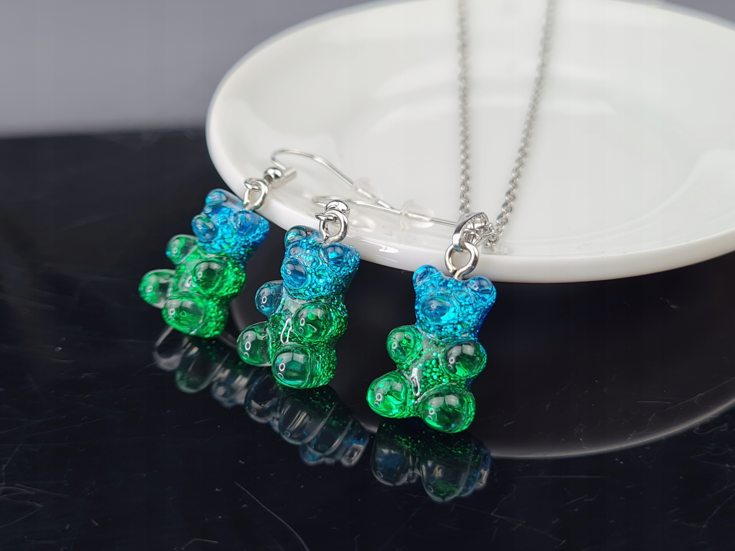 Komplet NASZYJNIK KOLCZYKI MIŚ HARIBO ŻELKI Niebiesko-Zielone Brokat K15