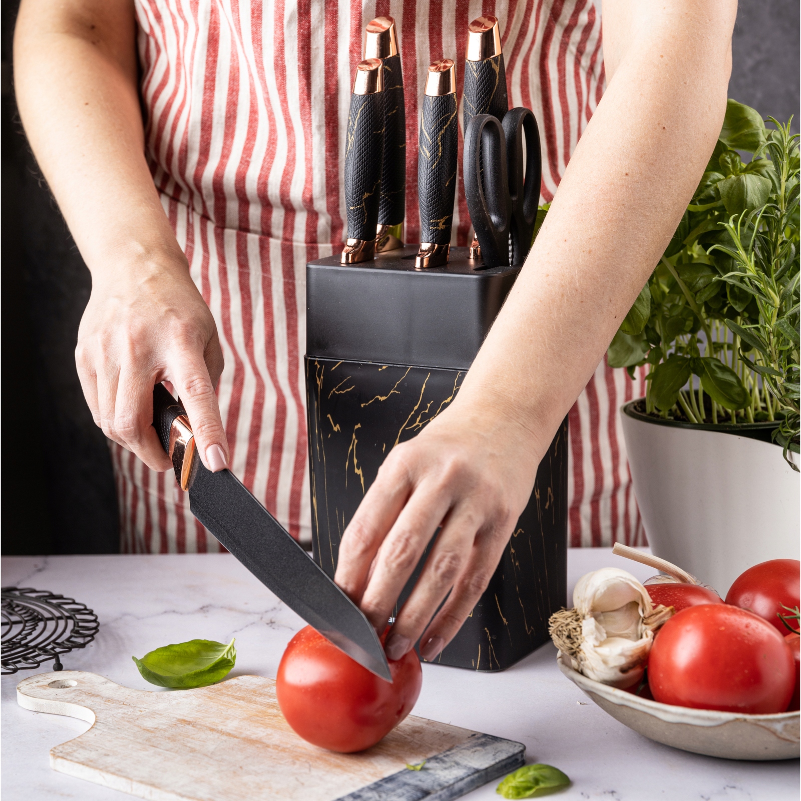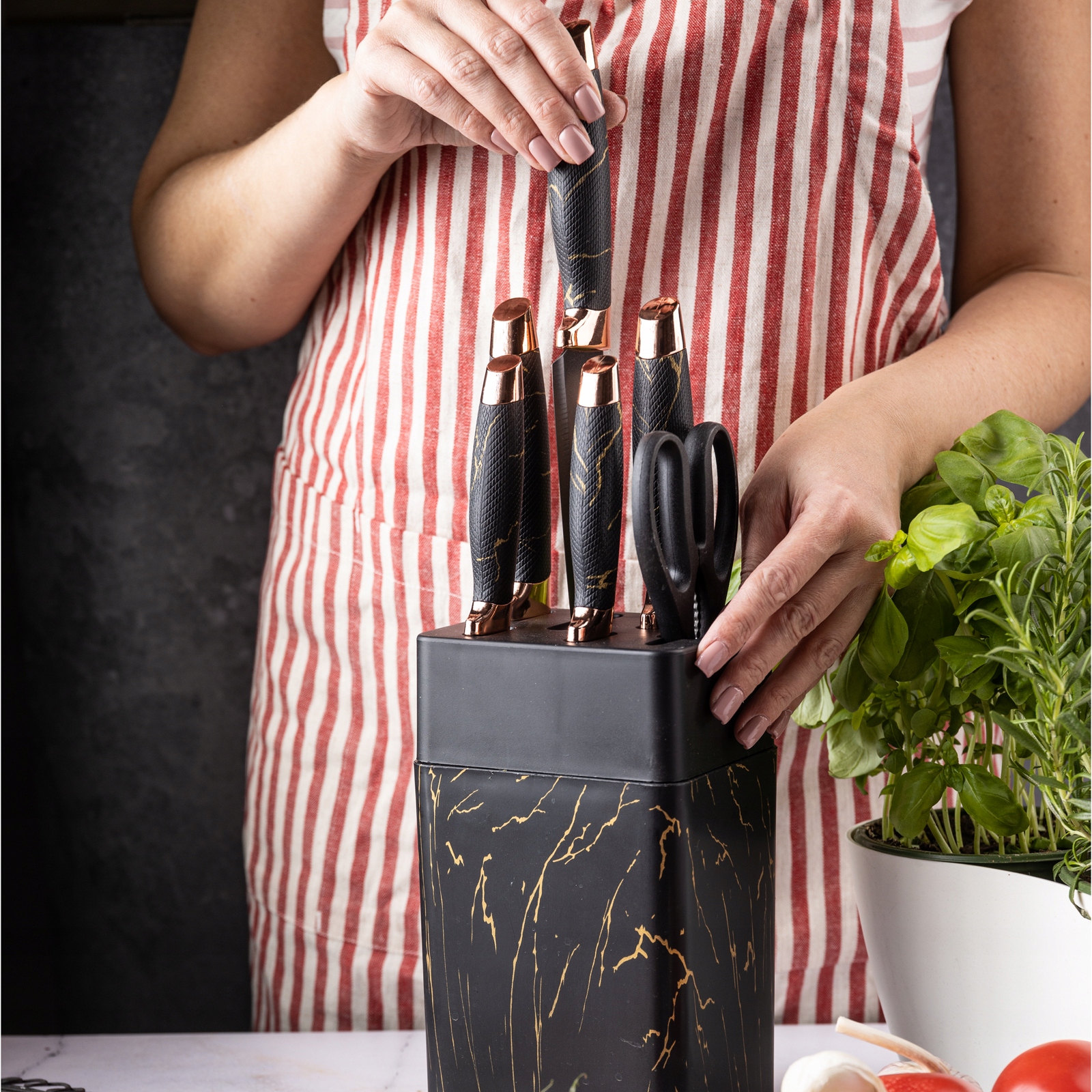 KOMPLET NOŻY KUCHENNYCH NOŻE 7 EL W ZESTAWIE STOJAK Blok Ostrzałka Nożyczki
