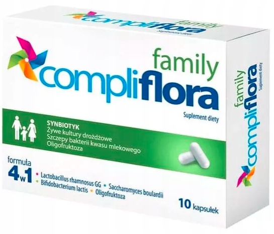 Комплифлора – синбиотик, предназначенный для младенцев, детей и взрослых. Он содержит живые культуры дрожжей (Saccharomyces boulardii) и два штамма молочнокислых бактерий, которые колонизируют как тонкий кишечник (Lactobacillus rhamnosus GG), так и толстый кишечник (Bifidobacterium Lactis). Продукт также содержит олигофруктозу, которая является особым питательным веществом для бактерий. Капсула Dr Caps®, изготовленная из инновационной гипромеллозы, помогает защитить ингредиенты продукта от неблагоприятного воздействия желудочной кислоты.