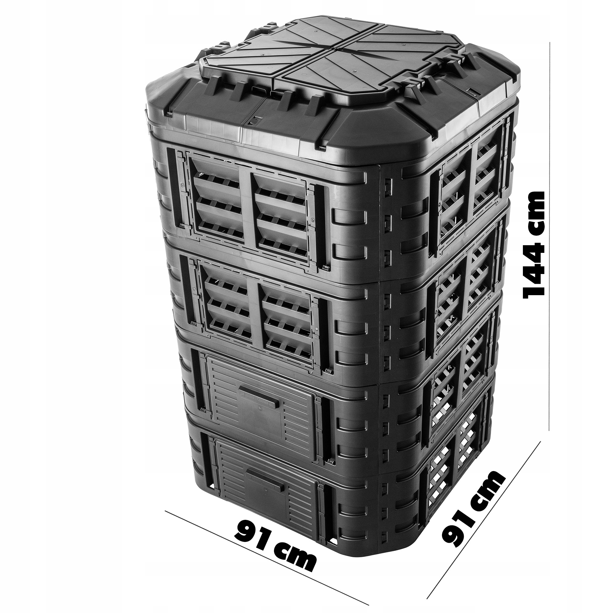 ✅Использованный материал характеризуется устойчивостью к деформации, трещинам и погодным условиям: морозу, ветру или УФ-излучению. Компостер выдерживает как сильные морозы (-30°С), так и жару (до +45°С), что делает его продуктом круглогодичного действия.