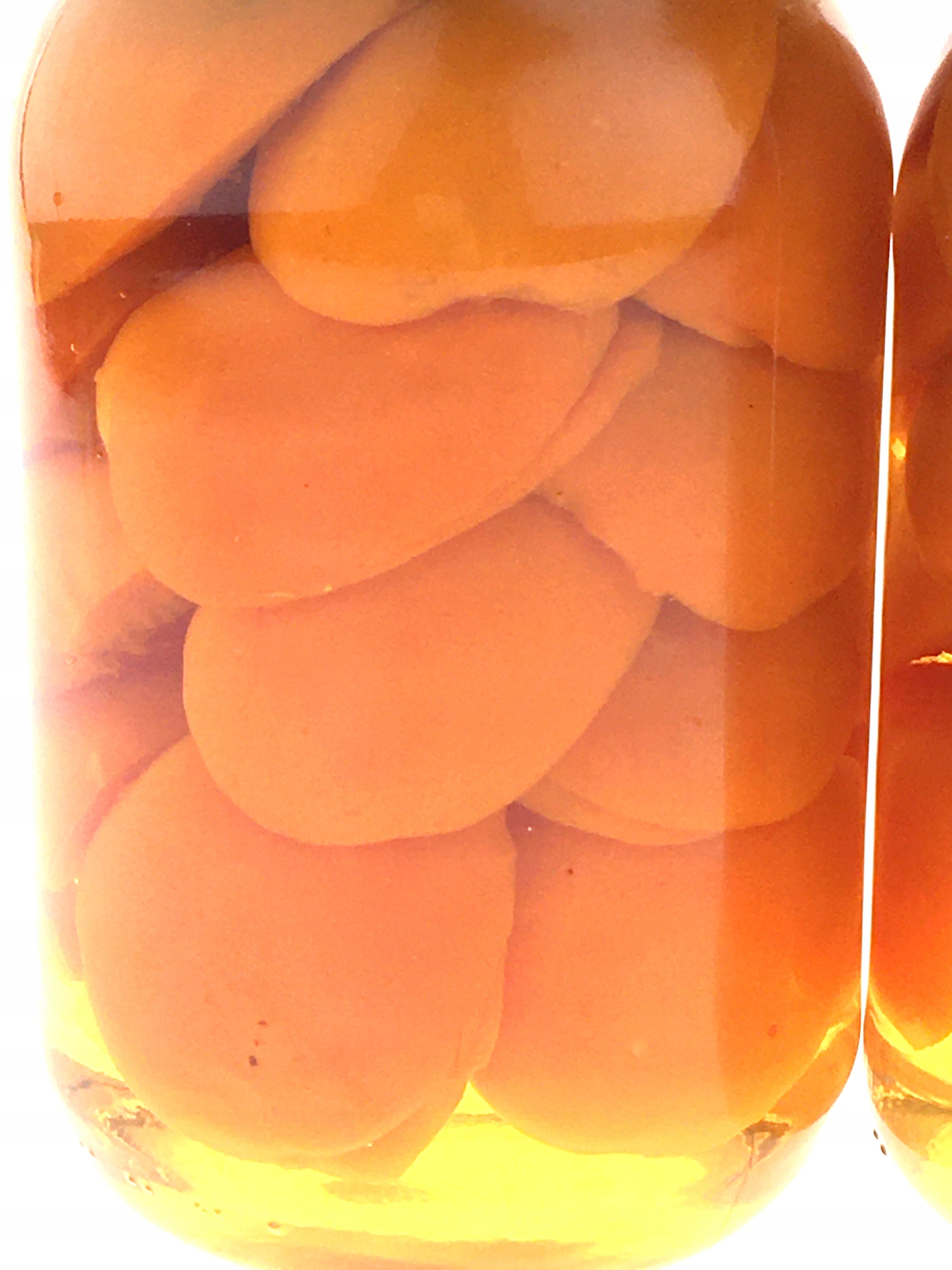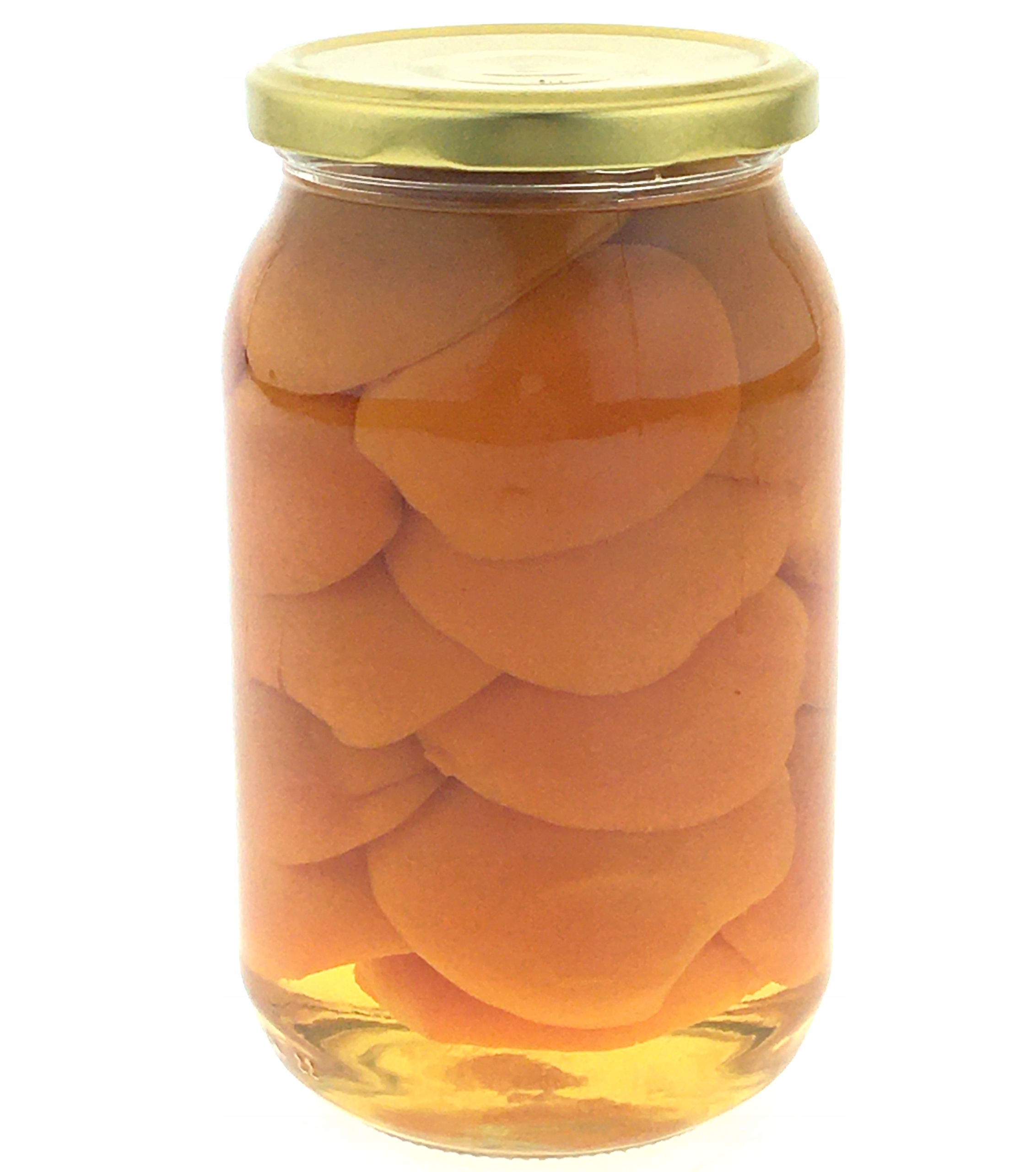 Половинки абрикосов плотно укладывают в банку, заливают кипячёным сиропом (вода+сахар), пастеризованные.