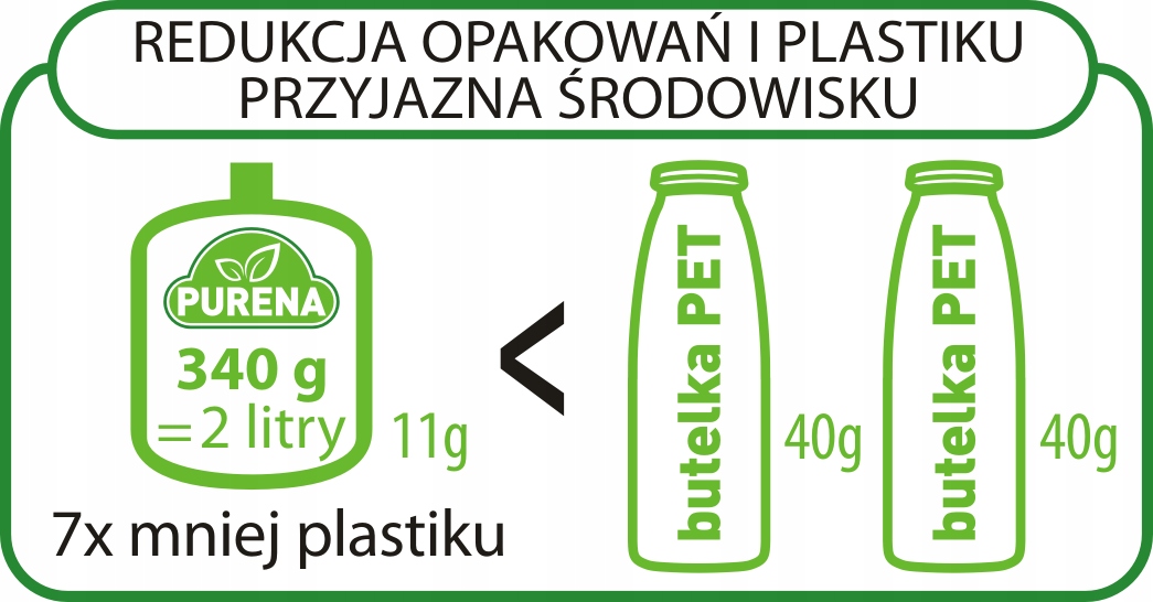 PURENA имеет преимущество перед традиционными решениями, такими как соки/напитки в картонной упаковке или бутылках емкостью 1 л. за счет устранения многих проблем, таких как место для хранения, большой вес, экономия упаковки и, прежде всего, благодаря правильному соотношению качества продукции и цены 1 литра напитка.