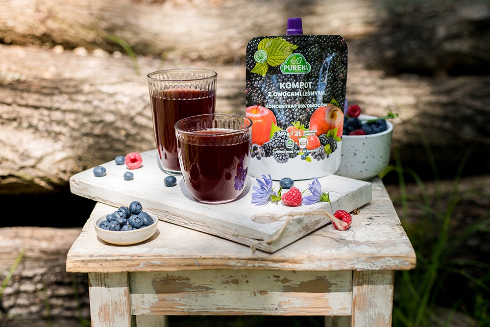 Компот из лесных ягод PURENA концентрат содержит 90% фруктов в концентрате.