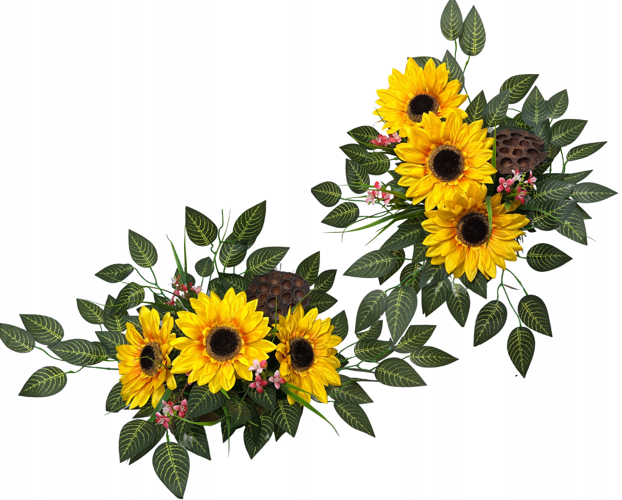 Цветочная композиция изготовлена из искусственных цветов высочайшего качества. и добавки. Для создания украшения были использованы цветы подсолнечника, засушенный цветок лотоса, большое количество зеленых листьев и красные украшения.