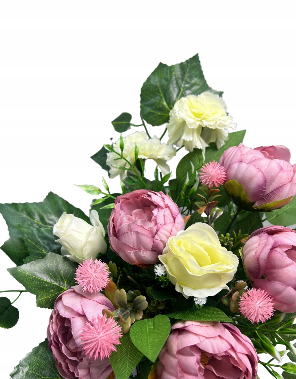 Надгробие с букетом выполнено из высококачественных искусственных цветов, которые вместе создайте уникальный цветочный декор, сочетающий в себе элегантность и утонченность.