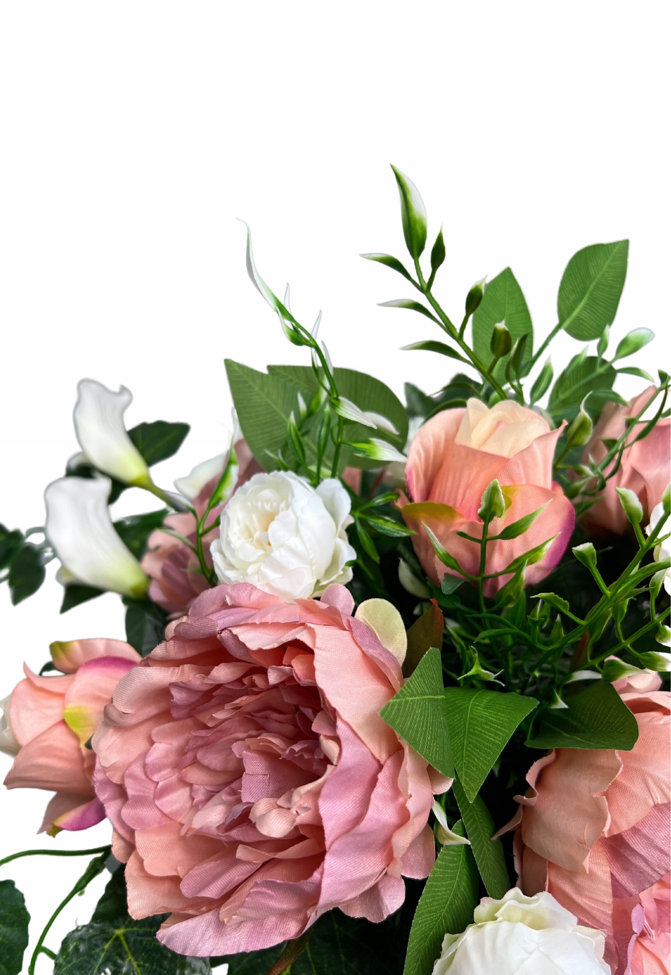 Цветочная композиция изготовлена из искусственных цветов высочайшего качества. и добавки. Для создания декораций мы использовали цветы каллы, нестареющие розы, красивые большие и маленькие пионы, большое количество зеленых листьев и украшения, которые прекрасно заполняют пустые пространства.