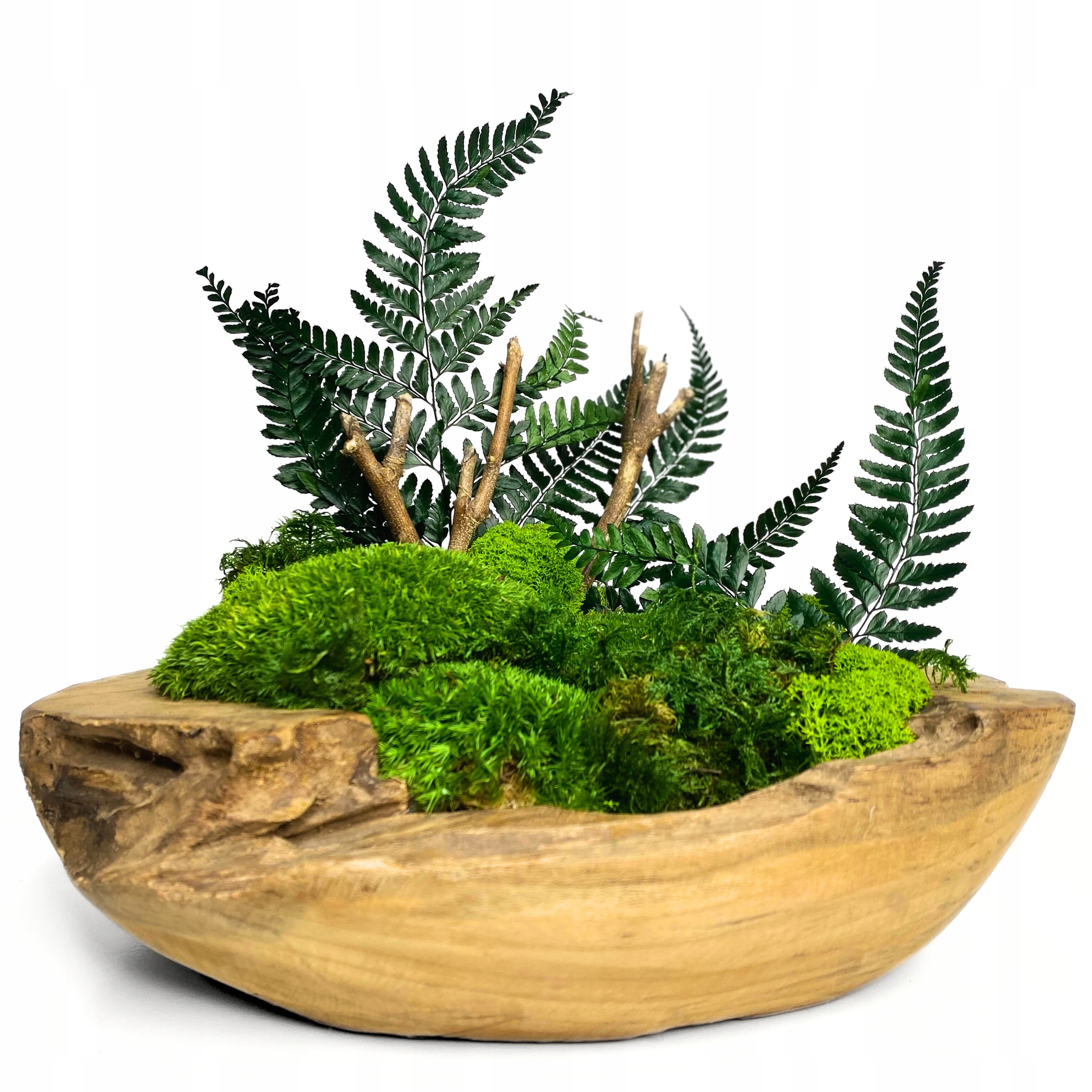 КОМПОЗИЦІЯ ДЕРЕВ’ЯНА ЧАША МОХ ТА СТАБІЛІЗОВАНІ РОСЛИНИ chrobotek декорація
