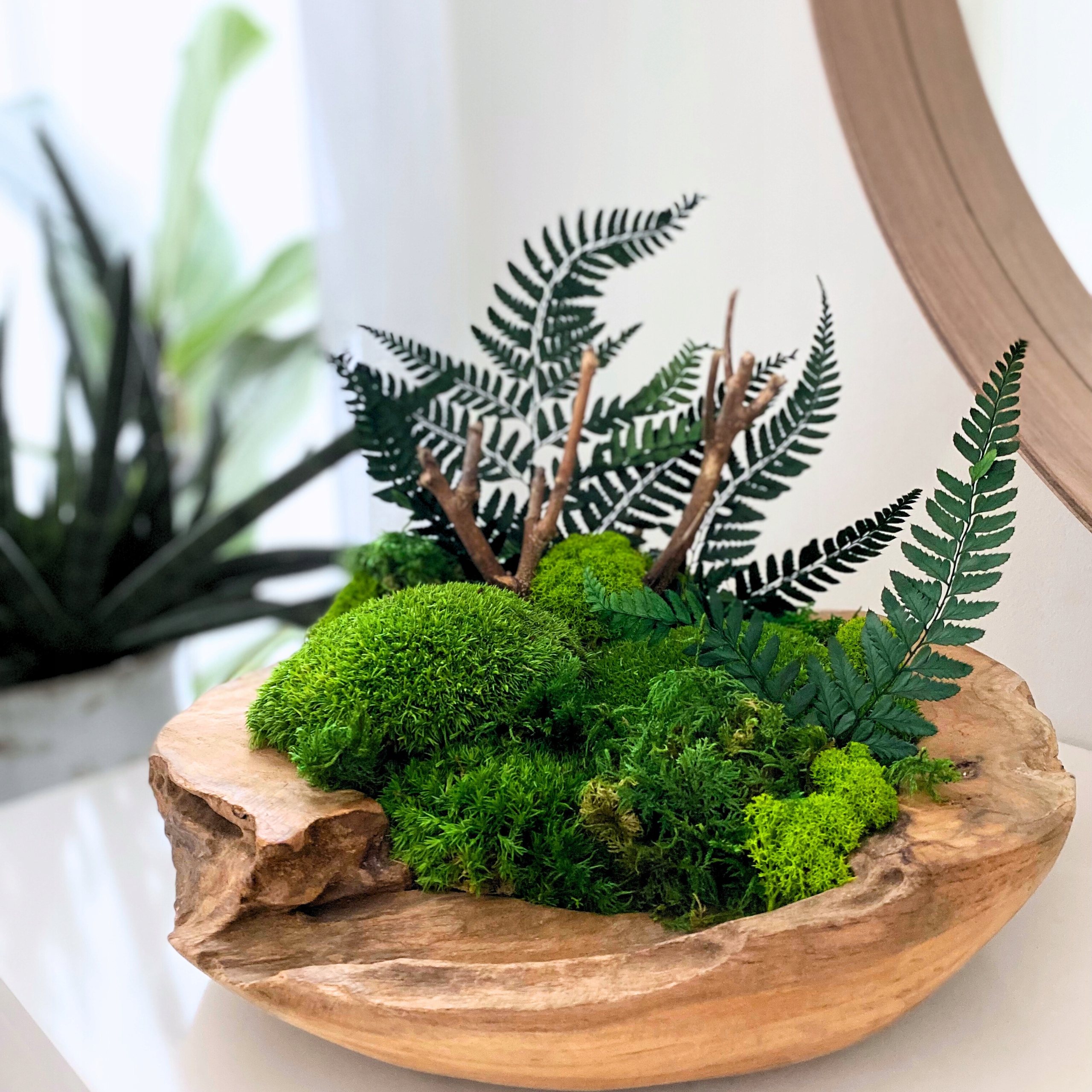 Внесите природу в свой дом с помощью нашей уникальной деревянной чаши из тика, наполненной композицией из различных мхов и стабилизированных растений. Каждая чаша уникальна, изготовлена вручную и тщательно составлена, что делает ее уникальным произведением искусства.