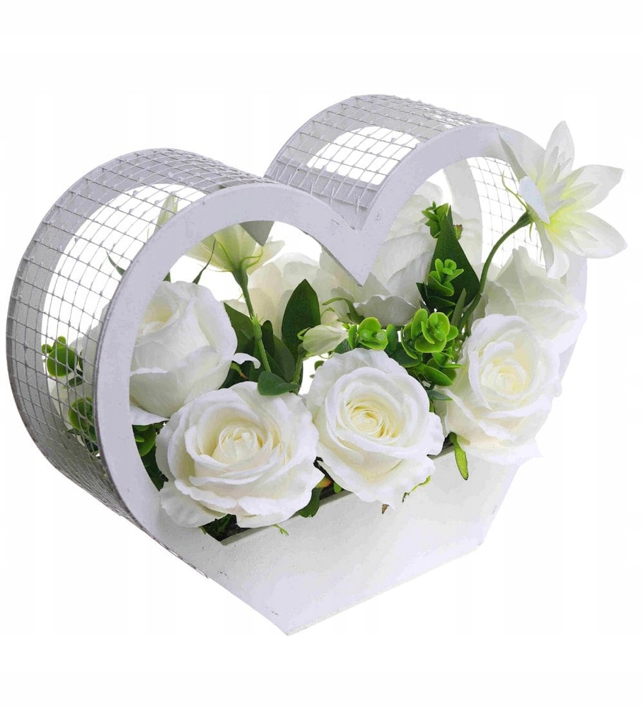 Уникальное украшение, которое порадовает каждого любителя элегантного дизайна и оригинальных решений. Мы представляем цветочную композицию - белый сердца, наполненное белыми розами , украшенные зелеными деталями, которые дают всю свежесть и естественное очарование.