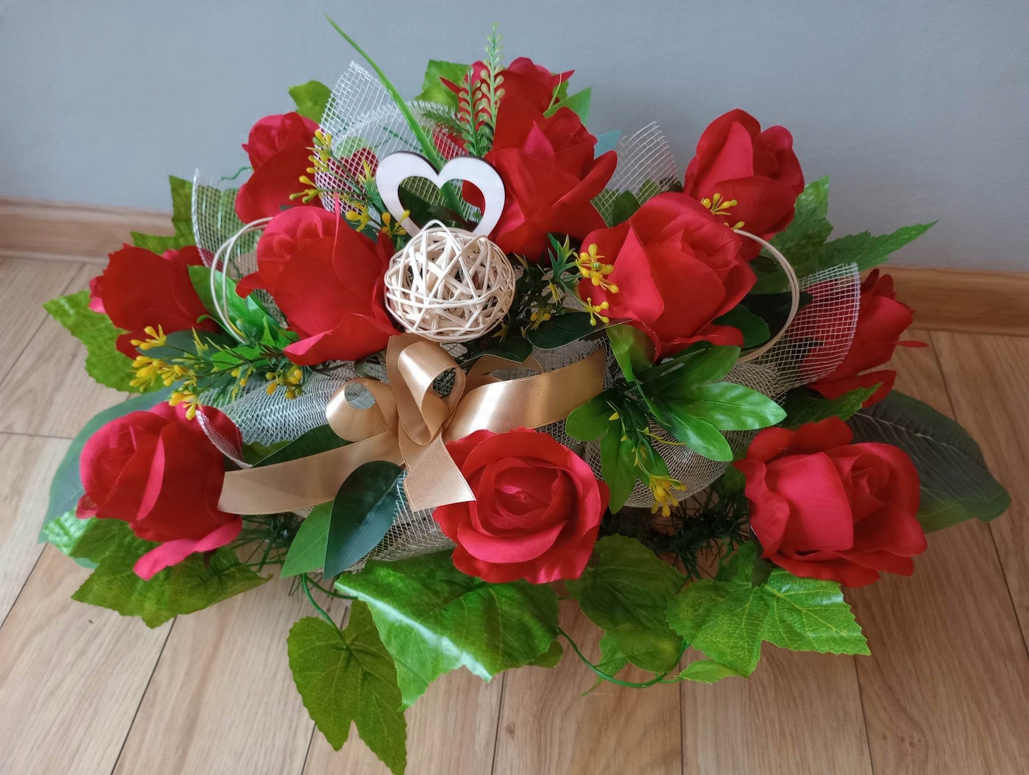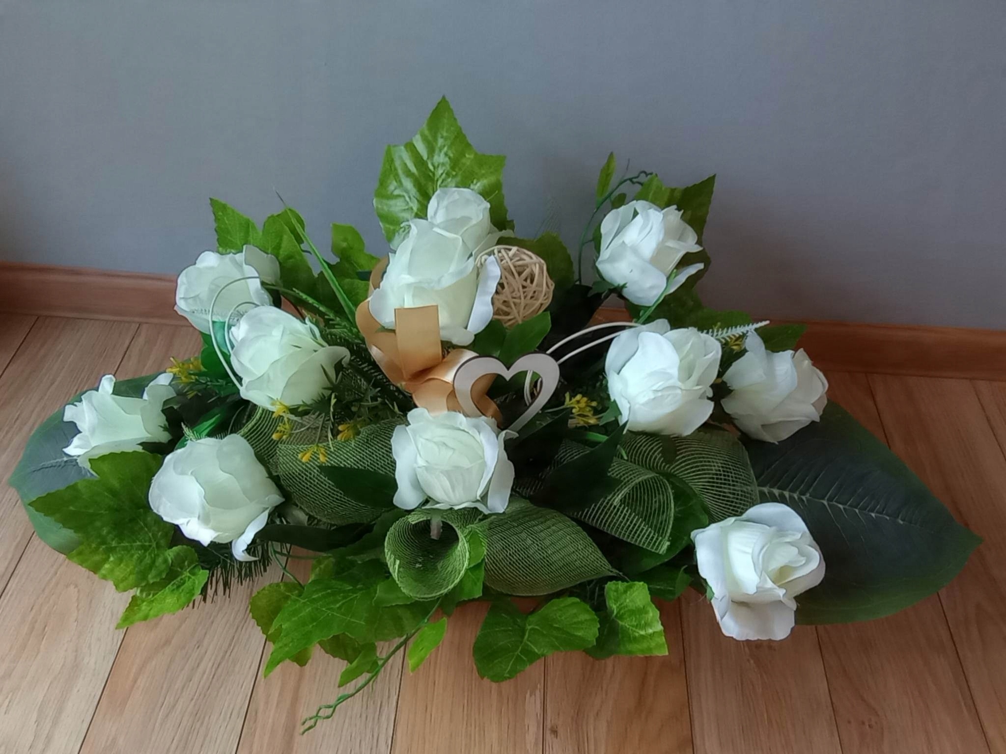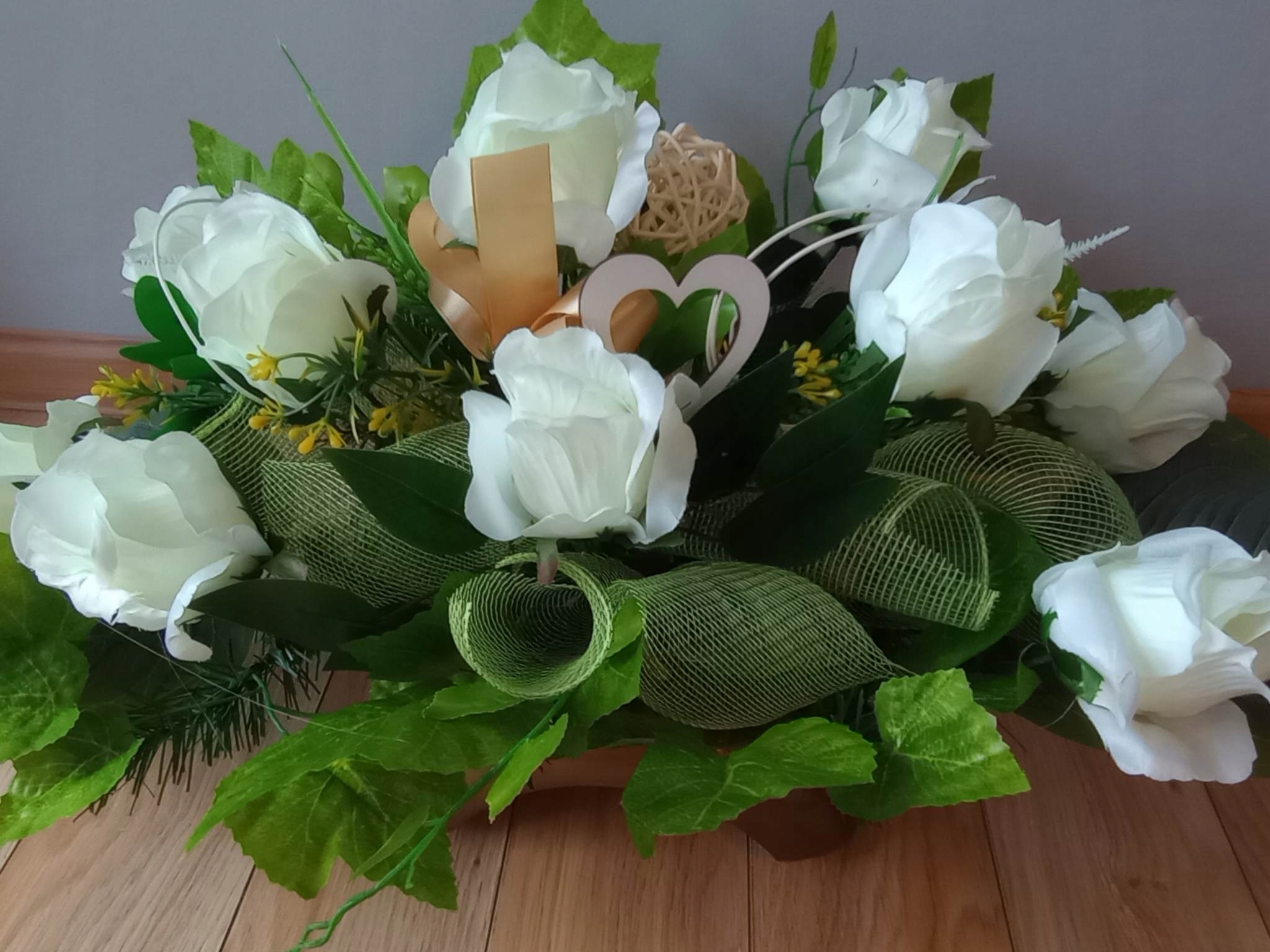 Композиция искусственная(так называемый венок, икебана) изготовлена из искусственной елки, забетонированной в пластиковый горшок, что придает ей устойчивость. Бетон придает ему соответствующий вес, что предотвращает скольжение могильной композиции. Длина композиции около 60 см, ширина 40 см.