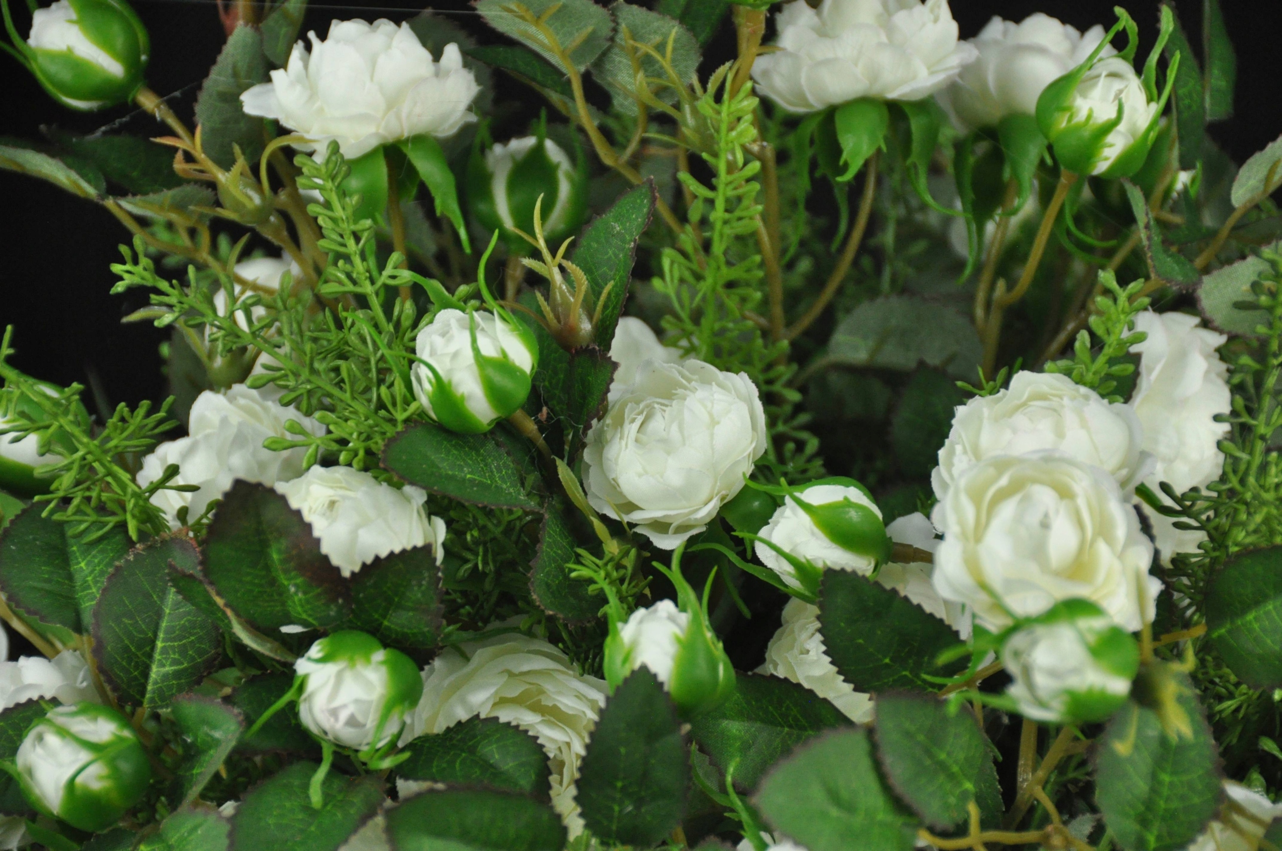Выполнена из очень качественных цветов: белые розы, аксессуары, листья.