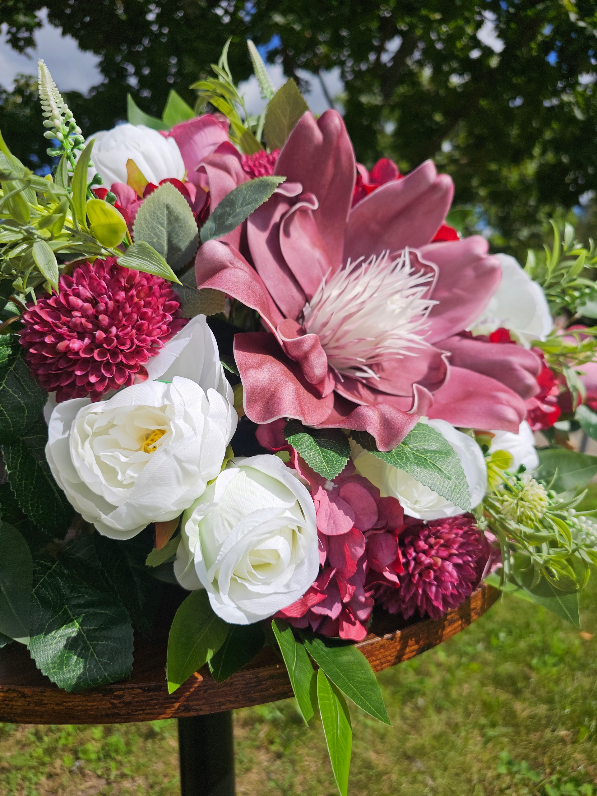 Банч, предназначенный для надгробия в тоне Бургундии-белоснеб с привязанными розовыми.