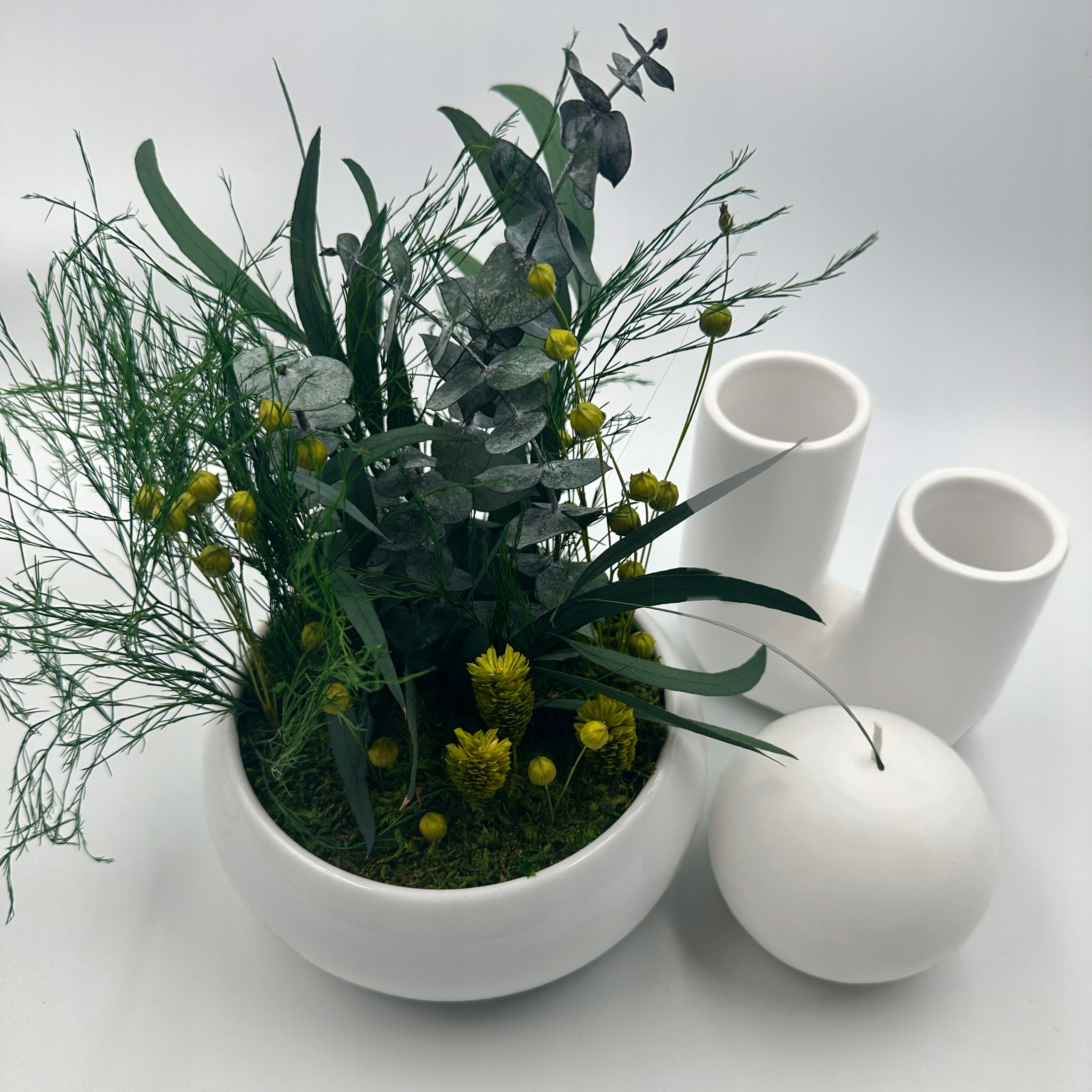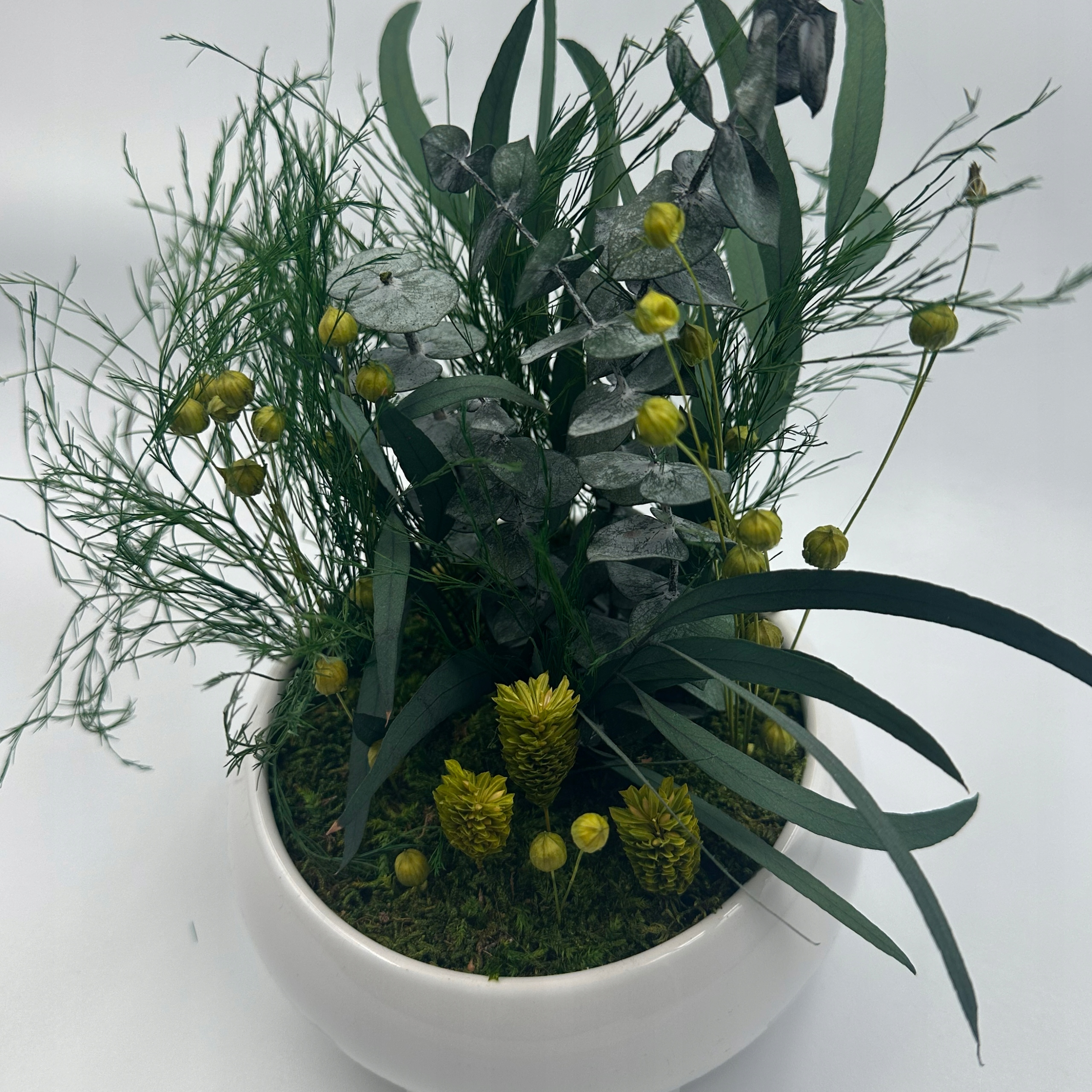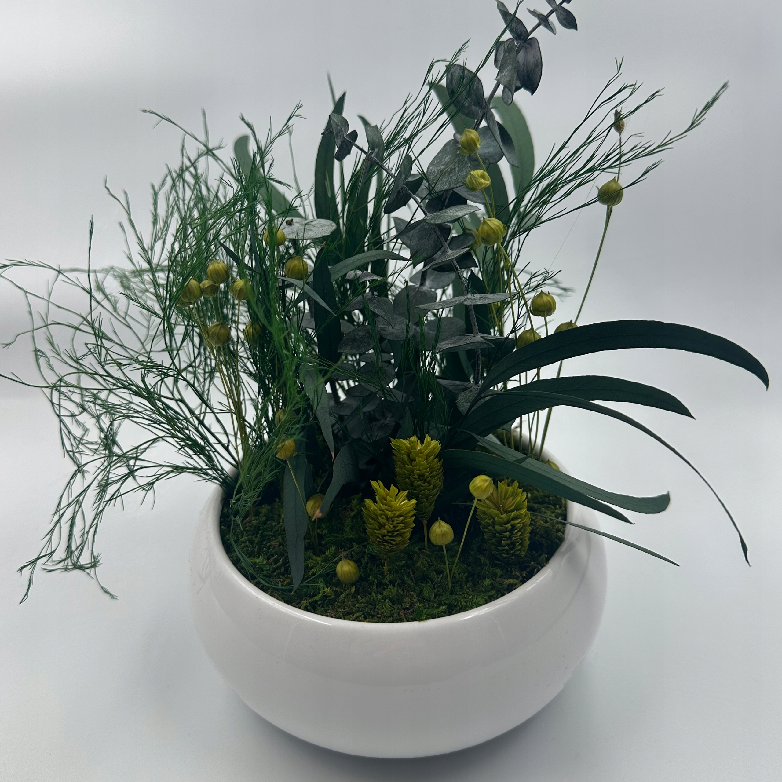 Композиция из стабилизированного мха и растений | Белый керамический цветочный горшок | Натуральная отделка без ПРЕМИУМ ухода