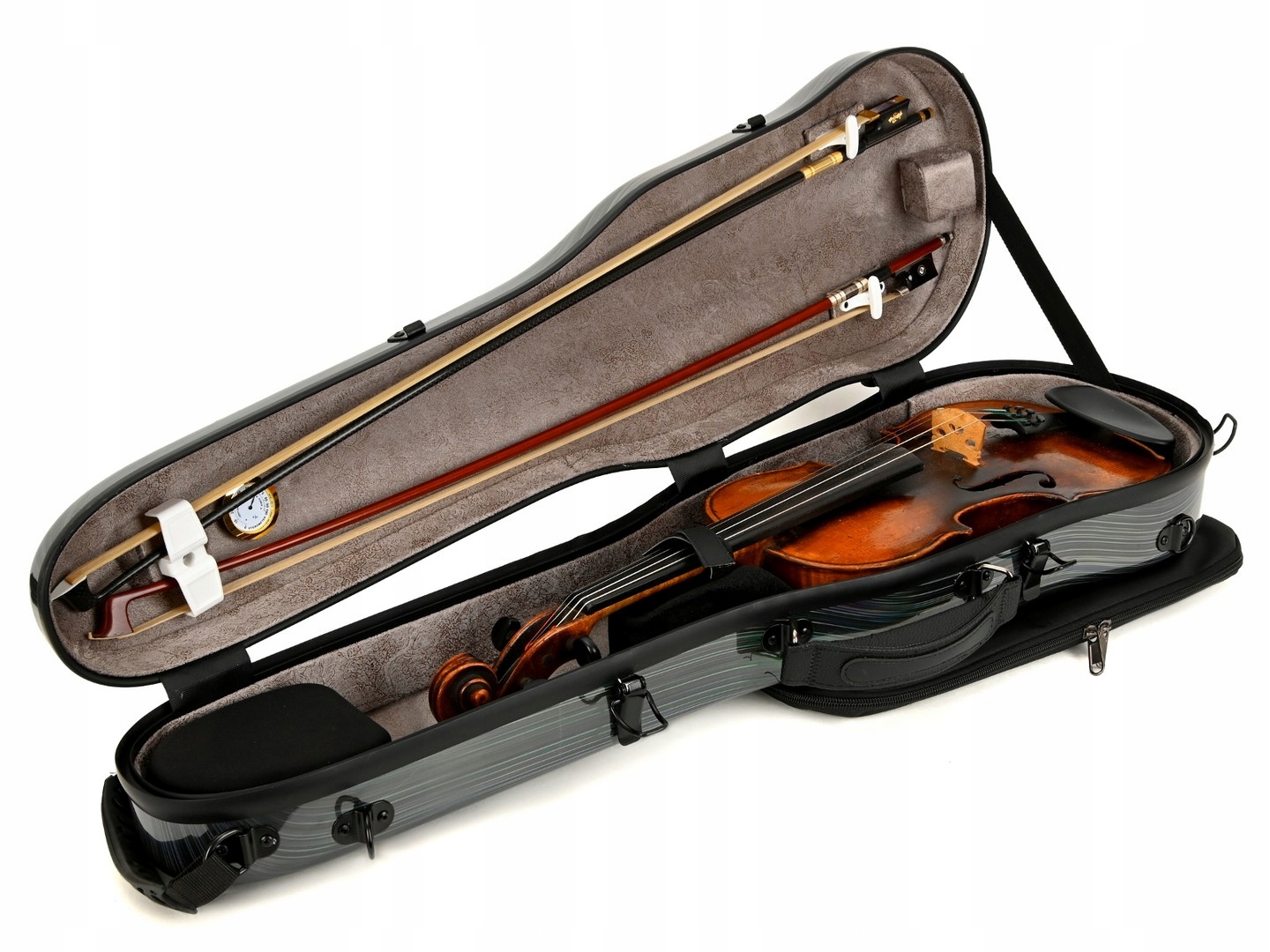 Легкий футляр для скрипки, изготовленный из поликарбоната и композита ABS. Форма чехла повышает долговечность кейса.