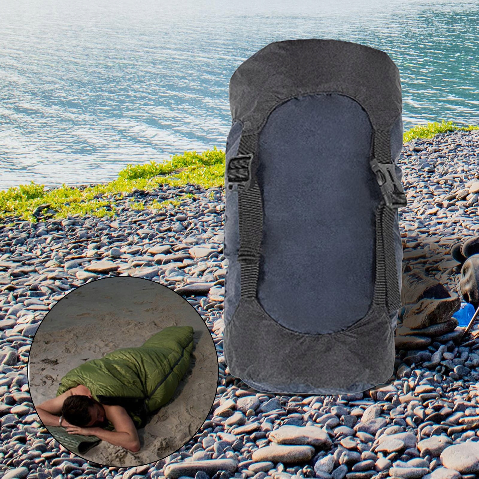 Прочный материал: наш компрессионный мешок для спального мешка изготовлен из высококачественной силиконовой ткани с нейлоновым покрытием 40D, которая является водонепроницаемой, устойчивой к разрывам и износу, сжимаемой и долговечной в использовании.