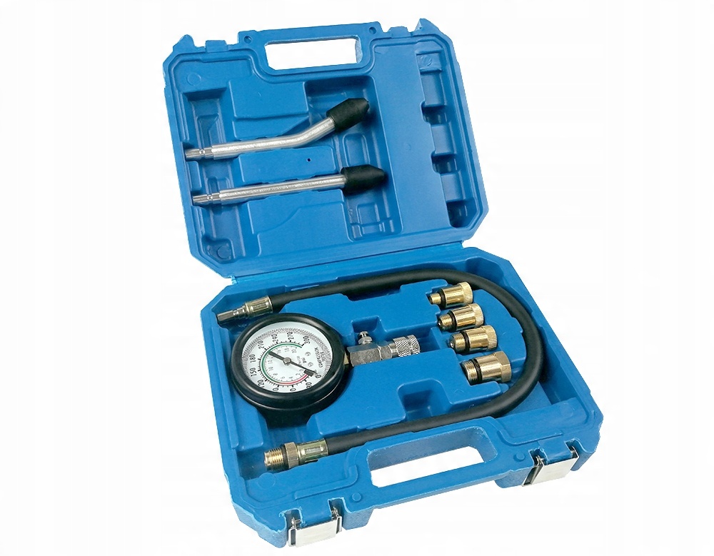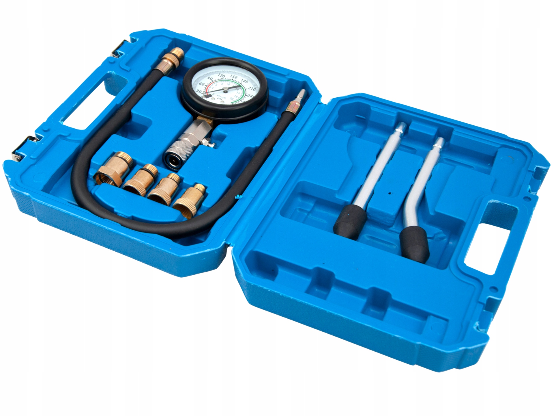 Тестер для проверки давления сжатия в цилиндрах бензинового двигателя с оборудованием, расширяющим его возможности. В пластиковом корпусе находится манометр с клапаном, прямой и изогнутый удлинитель, удлинитель напорного шланга и 4 переходника для подключения к баллонам. Детали оснащены быстроразъемными соединениями для удобного и быстрого монтажа.