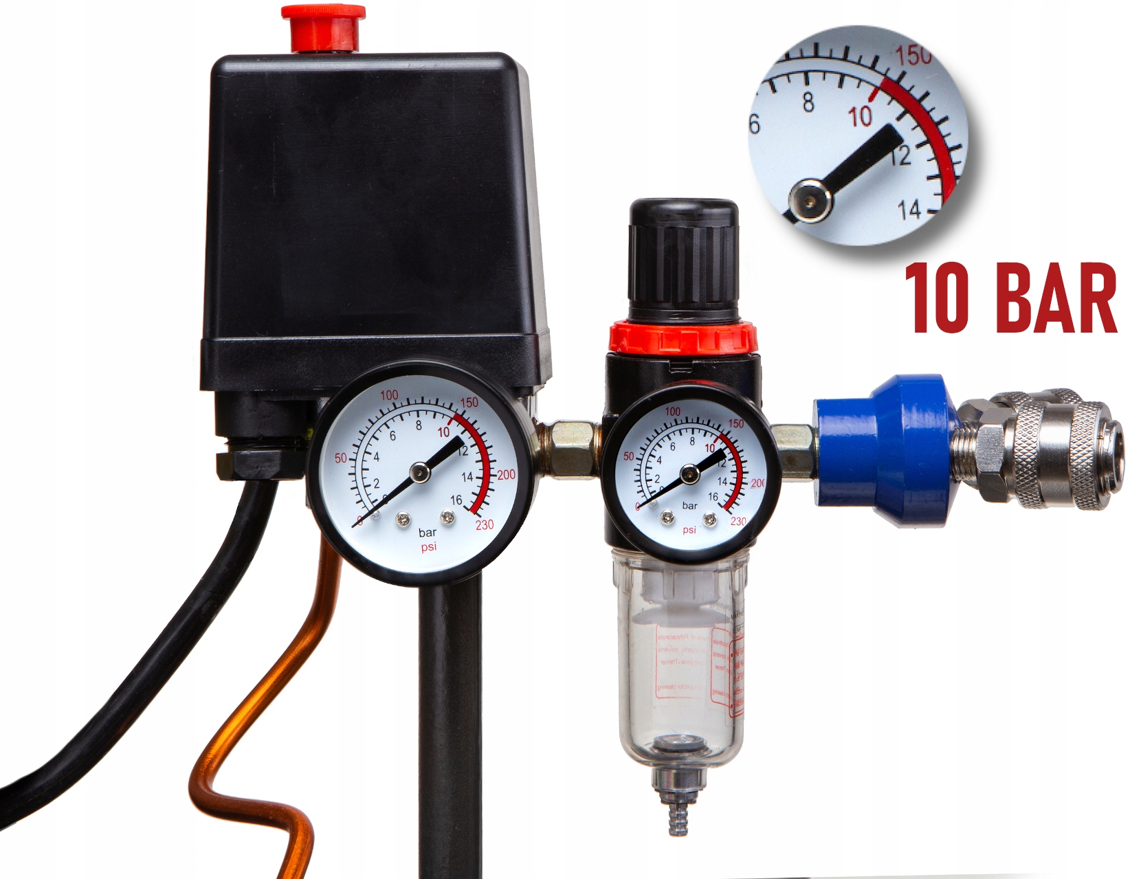 - точный манометр с двойной шкалой BAR и PSI отлично укажет текущее давление и облегчит работу,