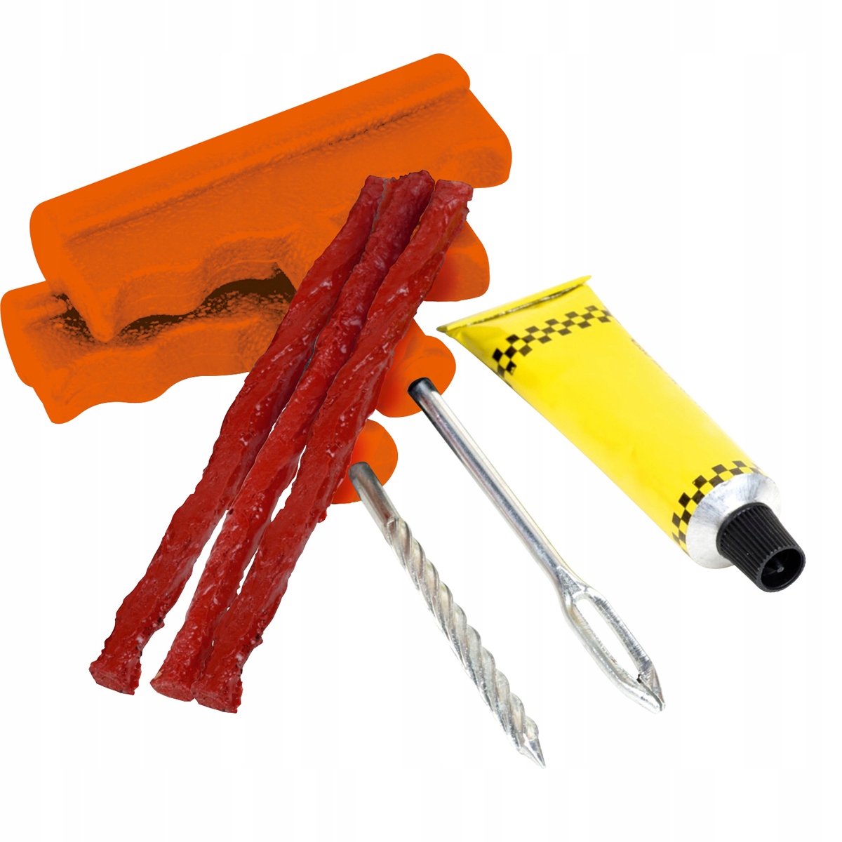 В комплект входят клей, резиновые нити и инструменты, которые позволят отремонтировать проколотую шину в полевых условиях.
