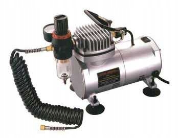 Мини -компрессор с редуктором воздуха, адаптированный для работы с аэрографом. Он имеет переключатель давления, который управляет работой компрессора. р>