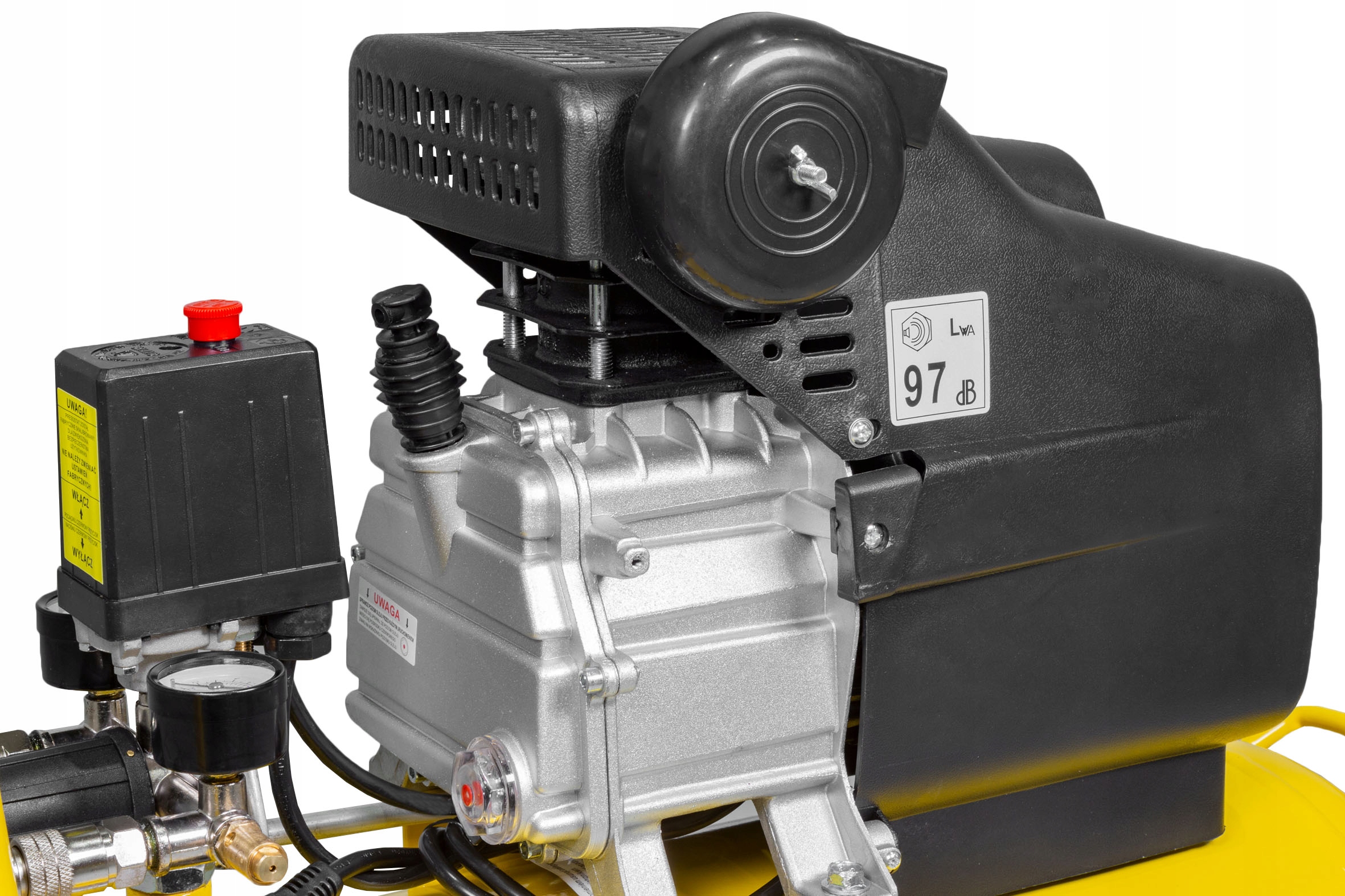 Двигатель устройства имеет максимальную мощность 2,8 кВт и скорость 2850 об/мин. Благодаря соответствующему передаточному числу компрессор работает на низких скоростях 1200 об/мин, что увеличивает срок его службы и ограничивает нагрев системы. Двигатель оснащен термозащитой, защищающей его от перегрузки.