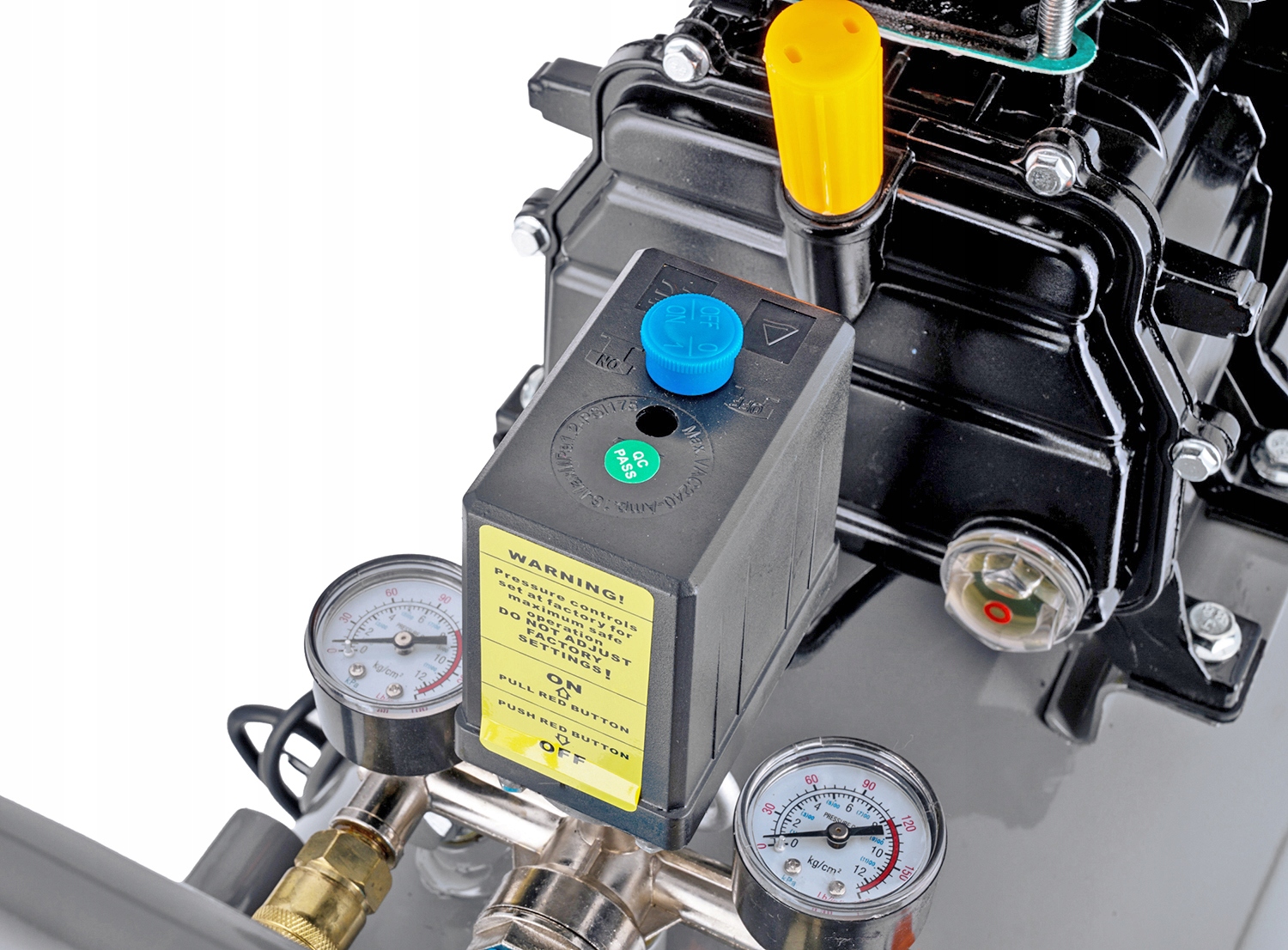 Компрессор оснащен автоматической системой масляной смазки, воздушного охлаждения, автоматическим прессостатом, отключающим компрессор при давлении 8 бар, воздушным фильтром с возможностью снижения давления и дренажным клапаном, установленным на цилиндр.