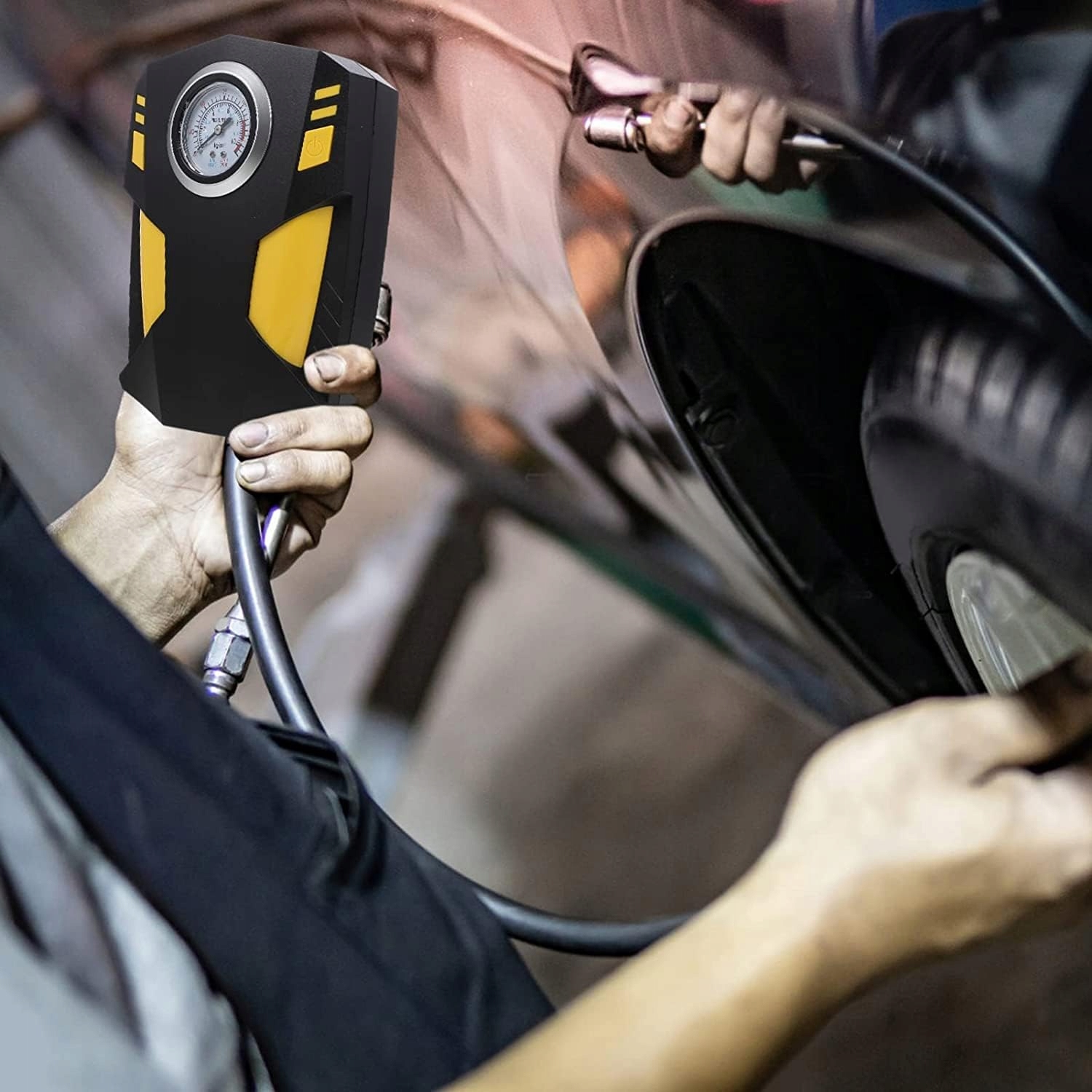 - Оснащен полным набором надувных насадок, которые можно использовать для накачивания шин, резиновых лодок, подушек безопасности, надувных игрушек, мячи и многое другое