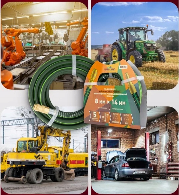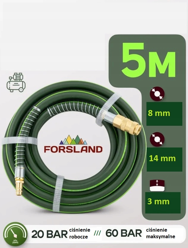 ШЛАНГ КОМПРЕССОРА, ПНЕВМАТИЧЕСКИЙ РЕЗИНОВЫЙ ШЛАНГ 8 мм x 14 мм, 5 м, 60 БАР, FORSLAND.