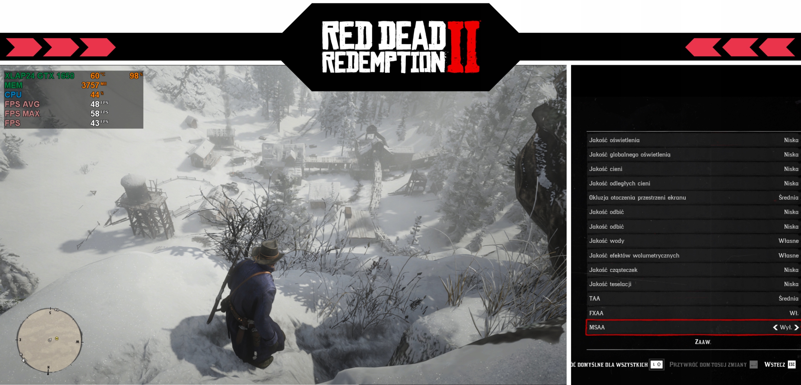 - Red Dead Redemption 2: разрешение Full HD, общие настройки графики низкие/высокие, средний FPS 48.
