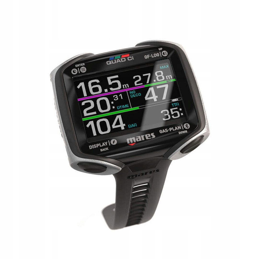 Подводный компьютер Mares QUAD CI оснащен алгоритмом Bühlmann ZH-L16C с регулируемыми коэффициентами градиента и альтернативными коэффициентами градиента, а также декомпрессией, контролируемой потолком. В подводном компьютере можно выбрать следующие смеси: воздух, найтрокс, тримикс и донный таймер. Этот подводный компьютер оснащен большим, легко читаемым восьмицветным MIP-дисплеем, на котором отображается информация о размере JUMBO и высоком разрешении. В комплект входит полностью наклоняемый цифровой компас с секундомером и памятью направления. Информация о давлении в цилиндре предоставляется за счет интеграции до 5 модулей. Благодаря цветному дисплею вы сразу сможете различить цвет, давление в бутылке и уровень насыщенности. Для удобства управления предусмотрены 4 одноразовые кнопки. Технические параметры:
