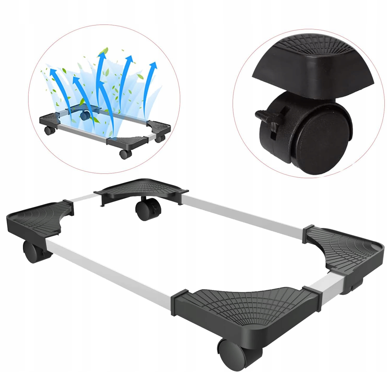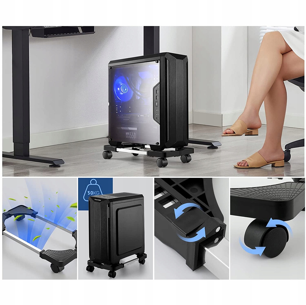 Это крепление для компьютерного корпуса оснащено четырьмя колесами, что позволяет легко перемещать тяжелые компьютеры. Два колеса можно заблокировать, чтобы коляска оставалась неподвижной.