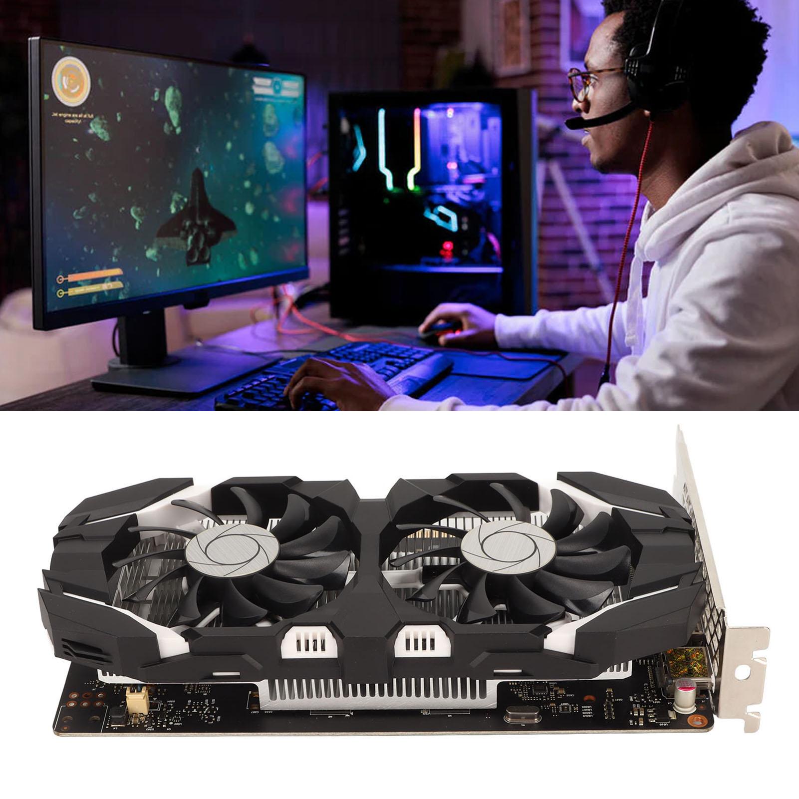 4. Двойные вентиляторы. Видеокарта графического процессора оснащена двумя охлаждающими вентиляторами, которые обеспечивают больший поток воздуха, бесшумную работу и отсутствие шумовых помех