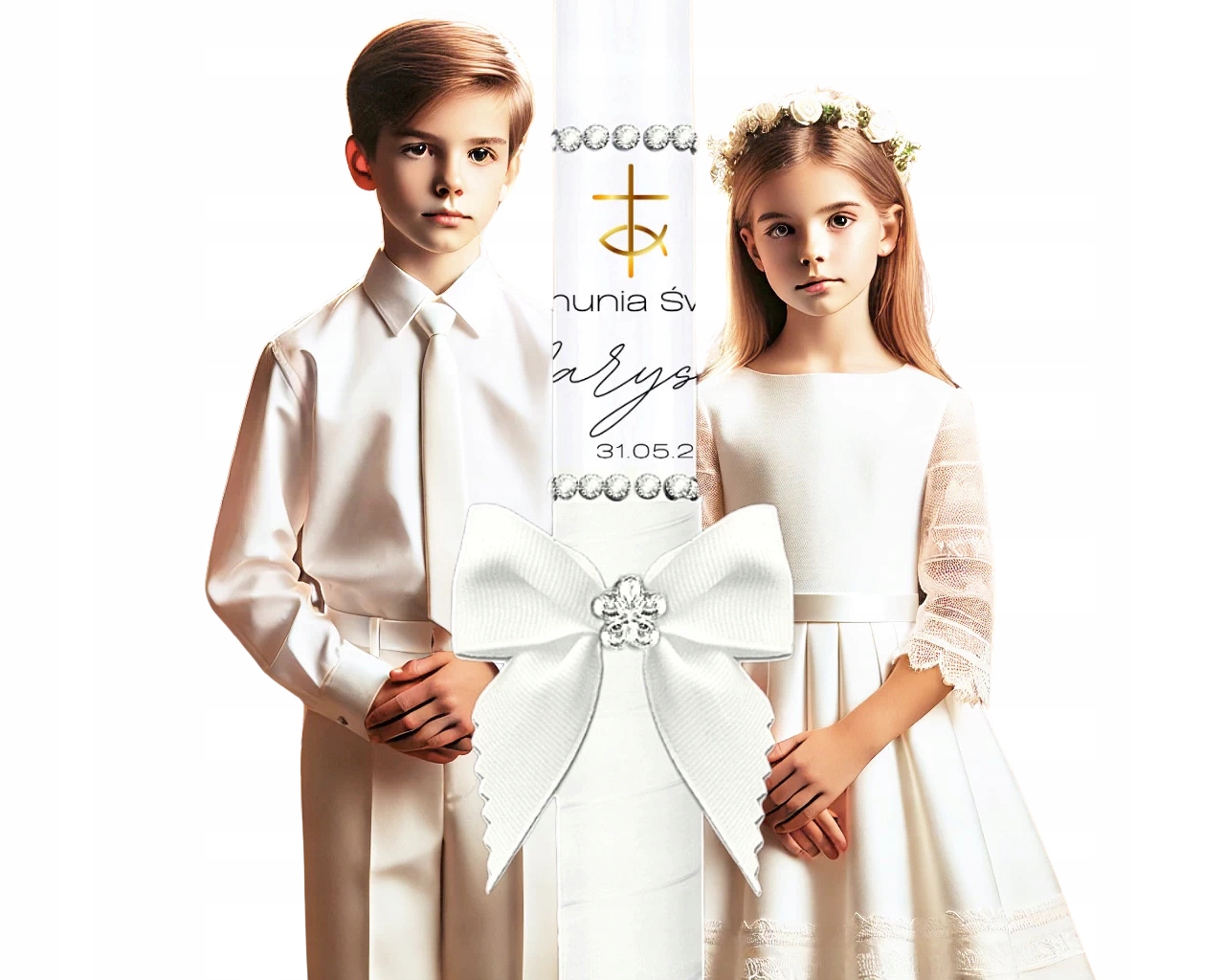 Изделие легкое и удобное, благодаря чему оно идеально помещается в маленькие ручки детей во время церемонии. Свеча имеет элегантный бантик и персонализированный принт, который придает ей неповторимый характер и делает ее прекрасным сувениром на долгие годы.