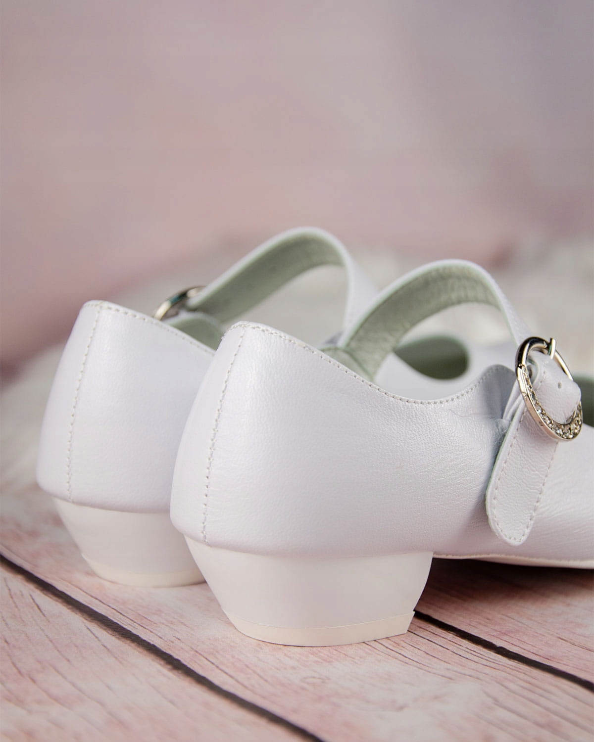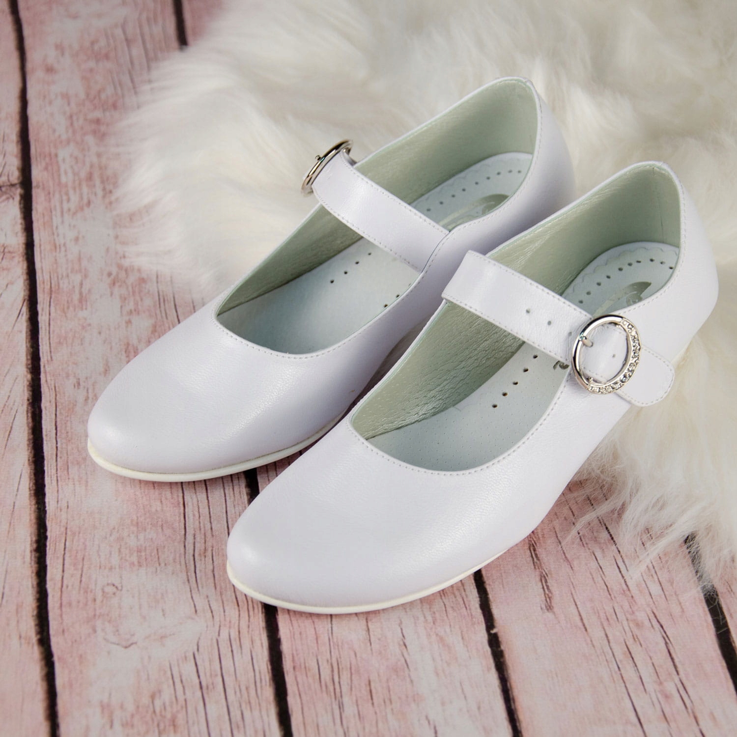 Элегантные белые туфли для причастия для девочек. Обувь имеет правильную форму, что делает ее очень удобной. Кроме того, спереди имеется ремень для лучшей поддержки стопы. Модель на тонком каблуке высотой 2,5 см, белого цвета. Гладкая модель, которая подойдет к любому платью или альбому. Внешняя часть обуви изготовлена из экологической кожи, а стелька – из натуральной кожи. Классические балетки идеально подходят как для Первого причастия, так и для других торжеств.