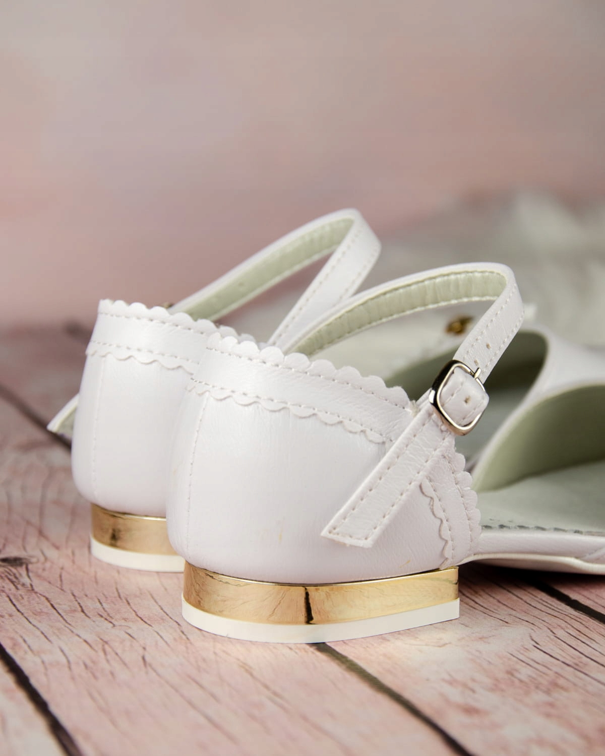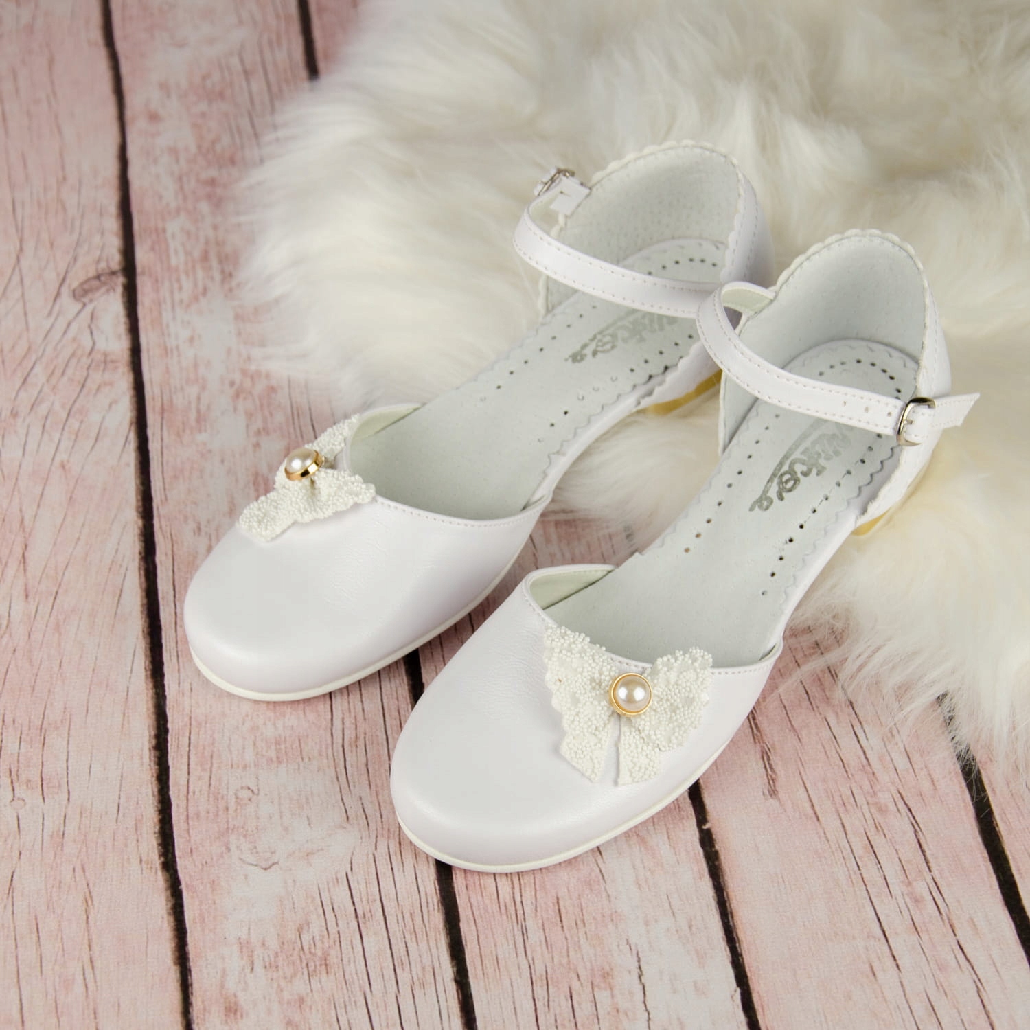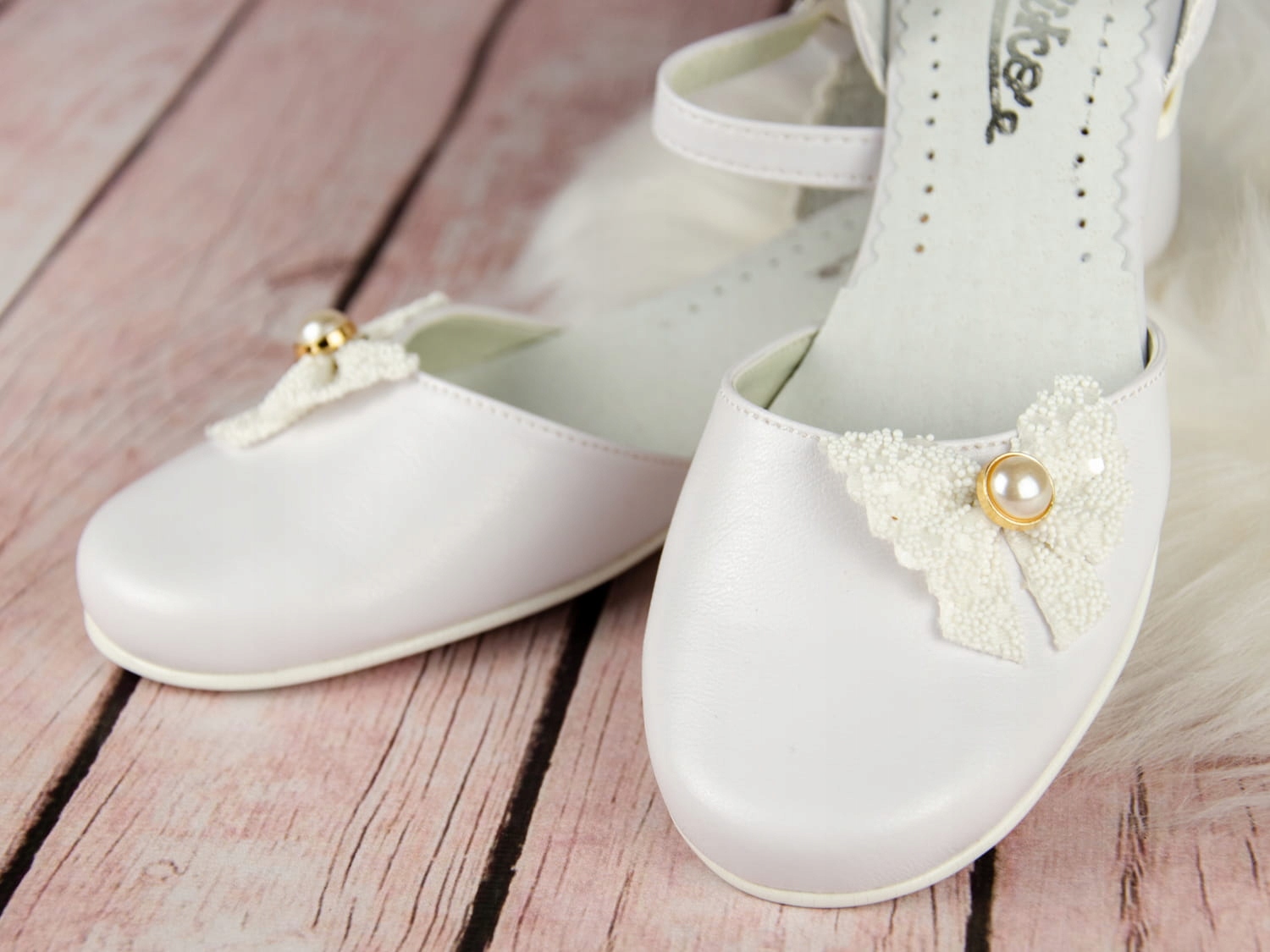 Элегантные белые туфли для причастия для девочек, застегиваются на регулируемый ремешок с пряжкой. Ботинки имеют правильную форму, поэтому надежно сидят на ноге. Модель имеет изящный каблук высотой 1,5 см, золотистого цвета. Очарования им добавляет красивый бантик из бисера с золотым декором. Внешняя часть обуви изготовлена из экологической кожи, а пятка и стелька – из натуральной кожи.