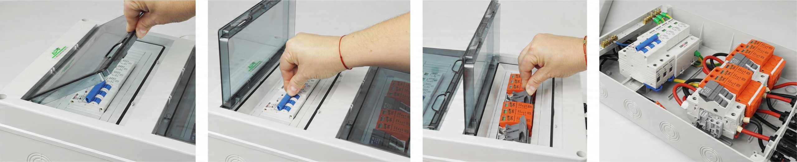 Комплект - фотоэлектрическое распределительное устройство накладного монтажа, две струны, 1000В постоянного тока 32А IP65, корпус из АБС, прозрачная дверца.
