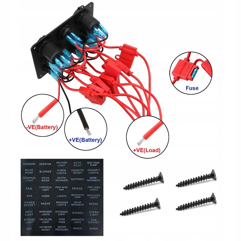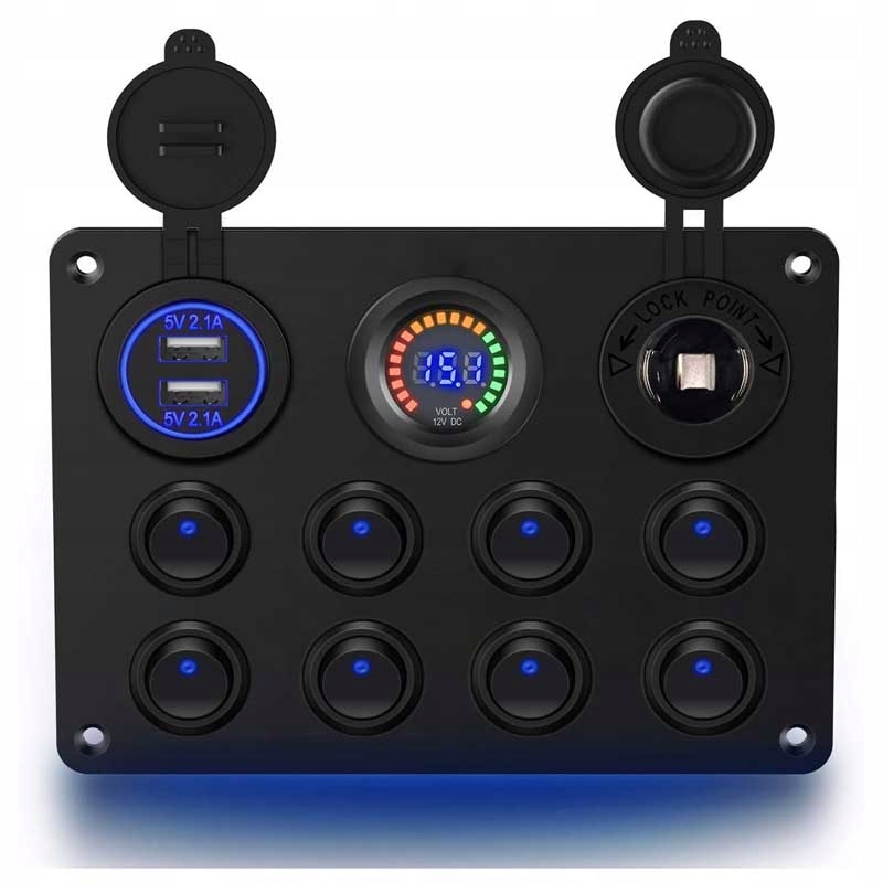 Панель электрического управления для яхты, с USB -сокетами, зажилками 12 В и вольтметром. Он имеет 6 светодиодных переключателей, синий освещен. Включает винты и наклейки для переключателей.