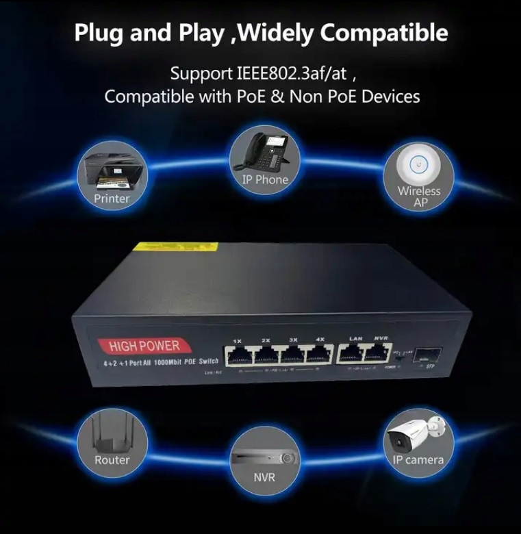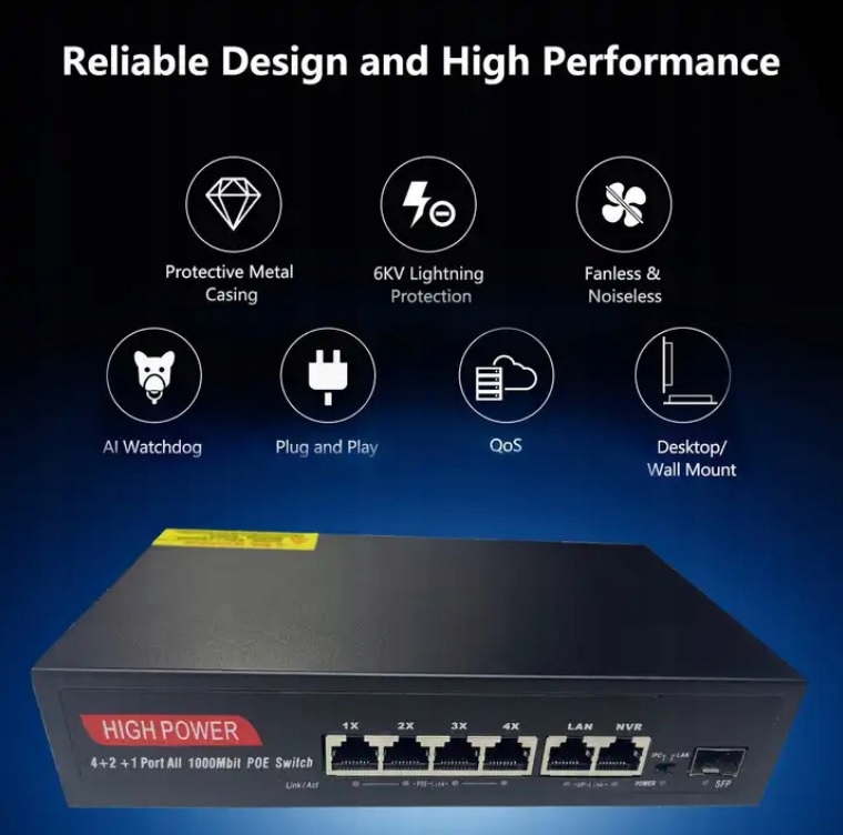 Коммутатор POE 4xPOE 2xUplink 1 Гбит/с + SFP 85 Вт HI-POE, предназначенный для IP-мониторинга. Устройство идеально подходит для систем мониторинга малого и среднего размера. Коммутатор обеспечивает дальность передачи данных до 250 м и дальность подачи питания для систем мониторинга. Никакой настройки не требуется. Высокий бюджет PoE делает устройство идеальным для систем мониторинга малого и среднего размера. Автоматические функции этого переключателя делают установку и эксплуатацию простыми и беспроблемными.