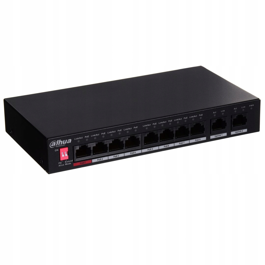 Dahua PFS3010-8ET-96-V2 — неуправляемый промышленный PoE-коммутатор с бюджетом мощности 96 Вт, имеющий 8 портов PoE 10/100 Мбит/с и два порта Uplink 10100/1000 Мбит/с.