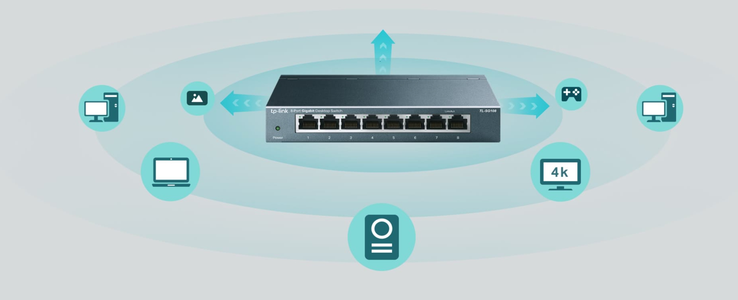 Коммутатор TL-SG108, оснащенный 8 портами 10/100/1000 Мбит/с, увеличивает пропускную способность сети, обеспечивая молниеносную передачу больших файлов. Пользователи дома, в офисе, в рабочих группах или в производственной среде теперь могут передавать большие файлы, требующие высокой пропускной способности. Это позволяет мгновенно обмениваться графическими, CGI, CAD или мультимедийными файлами по сети.