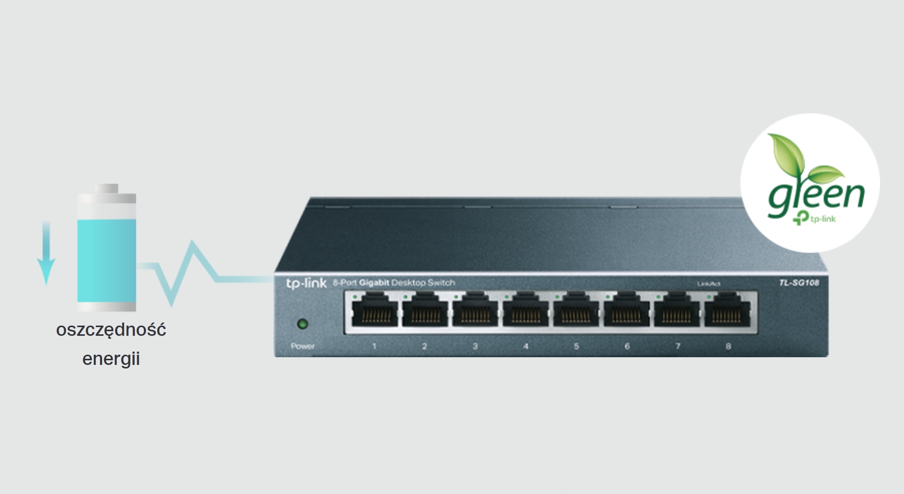 Традиционные сетевые коммутаторы потребляют значительное количество энергии для портов, даже когда подключенные к ним устройства выключены. Коммутатор TL-SG108 автоматически определяет состояние подключения каждого порта, снижая энергопотребление неактивных портов.