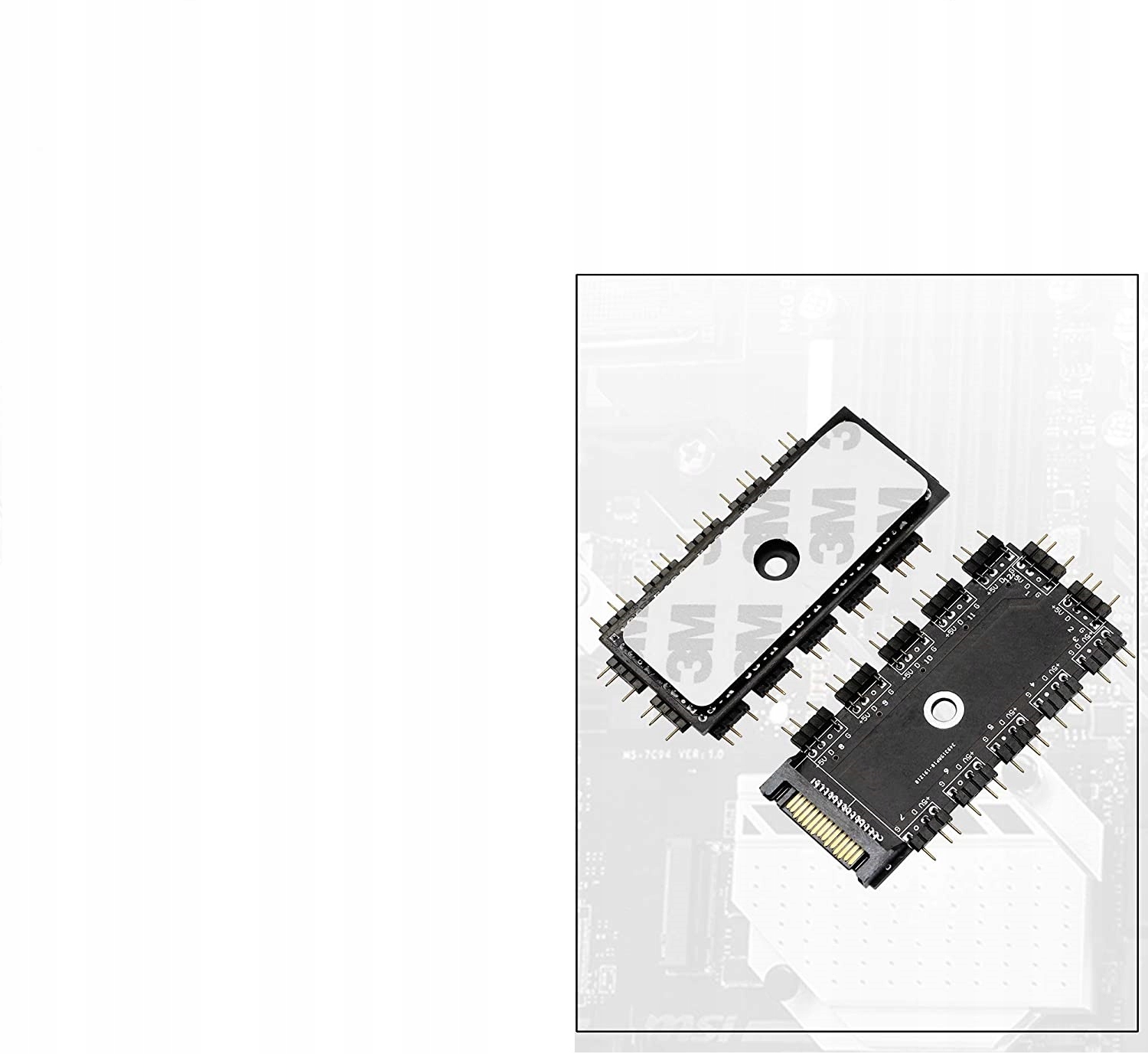 - Разветвитель концентратора используется для распространения сигнала aRGB. Он может отправлять сигнал на двенадцать элементов aRGB. Он совместим с элементами aRGB с 3-контактным разъемом aRGB. Питание берется из порта SATA. К разветвителю можно подключить продукты aRGB, такие как подсветка вентиляторов, светодиодные ленты aRGB или подсветки с водяным охлаждением. С обратной стороны адаптера имеется клейкая лента, которая легко и надежно приклеит плату к корпусу компьютера. В комплект входит кабель aRGB