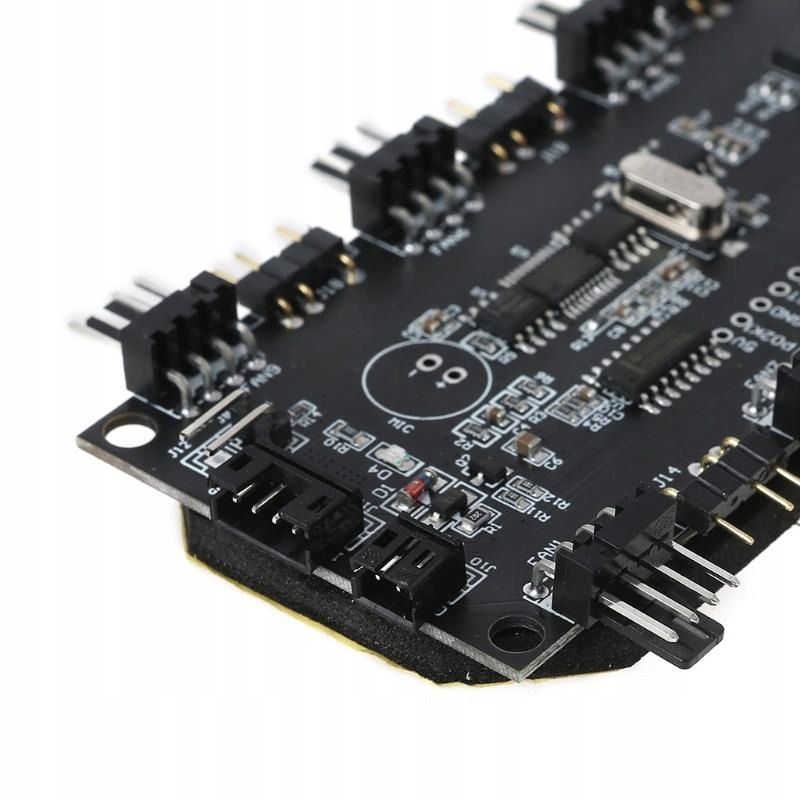 Разветвитель концентратора используется для распределения сигналов ШИМ и aRGB. Он может отправлять сигнал семи вентиляторам или элементам aRGB. Он совместим с 3-контактными и 4-контактными вентиляторами, а также с элементами aRGB с 3-контактным разъемом aRGB 5 В. Питание берется из порта SATA. Красный разъем используется для подключения вентилятора процессора. Управление как с пульта для компьютеров без возможности управления подсветкой aRGB, так и с материнской платы, оснащенной такими технологиями AURA, как (MSI Mystic Light, Asus AURA, GIGABYTE RGB Fusion 2.0). Одна настройка на пульте дистанционного управления синхронизирует все вентиляторы и элементы eRGB. К сплиттеру также можно подключить другие продукты aRGB, например светодиодные ленты aRGB или подсветку с водяным охлаждением. С обратной стороны адаптера имеется клейкая лента, которая легко и надежно приклеит плату к корпусу компьютера. В комплект входят кабели питания SATA, PWM и aRGB для подключения к материнской плате.